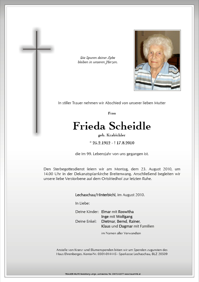 13.12.1901 17.08.2010 Lechaschau Frieda Scheidle Action Parte Sterbebild Gedenkkerzen Kondolenzen Parte Sterbebild Gedenkkerzen Kondolenzen Parte herunterladen Sterbebild herunterladen Gedenkkerzen für Frieda Scheidle 6 Einträge Kerze anzünden Werner. K Fam. Margreth Rauth-Zangerl ein Licht für dich Frieda Werner Krabichler Werner Krabichler ein Licht für dich Ihre Gedenkkerze fürFrieda Scheidle Ihr Name* Farbe auswählen Ihre Nachricht oder Name* E-Mail-Adresse* Mit dem Klicken auf "Kerze anzünden" erklären Sie sich mit unseren Datenschutzbestimmungen einverstanden. Kondolenzbuch für Frieda Scheidle 0 Einträge Kondolenz verfassen Ihr Abschiedsgruß an Frieda Scheidle Ihr Name* E-Mail-Adresse* Ihre Nachricht* Mit dem Klicken auf "Gruß absenden" erklären Sie sich mit unseren Datenschutzbestimmungen einverstanden.