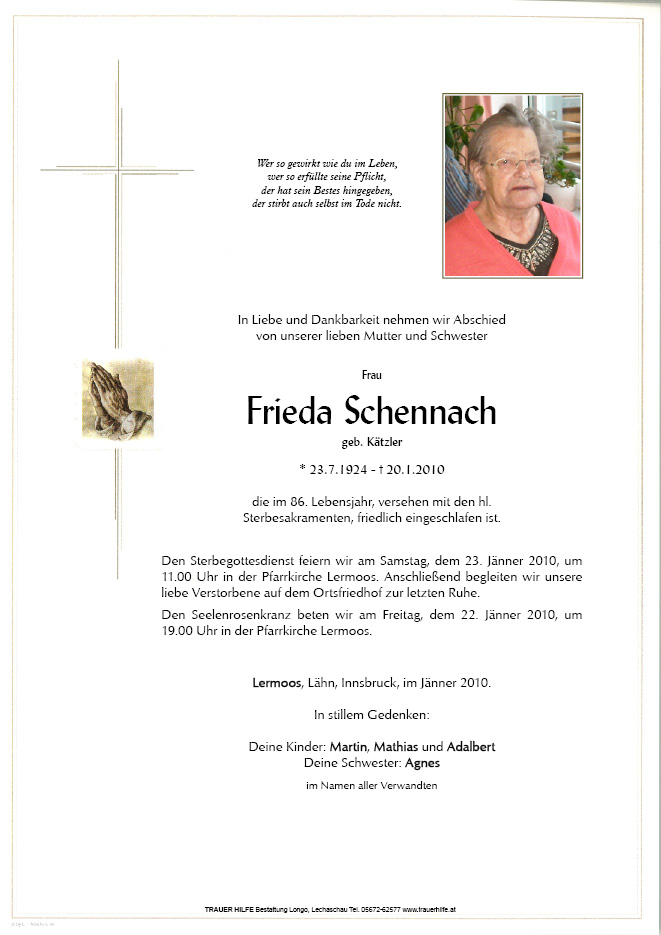 13.12.1901 20.01.2010 Lermoos Frieda Schennach Action Parte Sterbebild Gedenkkerzen Kondolenzen Parte Sterbebild Gedenkkerzen Kondolenzen Parte herunterladen Sterbebild herunterladen Gedenkkerzen für Frieda Schennach 4 Einträge Kerze anzünden Neujahrskerze für dich Ruhe in Frieden Jahrtagkerze A Liachtl für di Ihre Gedenkkerze fürFrieda Schennach Ihr Name* Farbe auswählen Ihre Nachricht oder Name* E-Mail-Adresse* Mit dem Klicken auf "Kerze anzünden" erklären Sie sich mit unseren Datenschutzbestimmungen einverstanden. Kondolenzbuch für Frieda Schennach 0 Einträge Kondolenz verfassen Ihr Abschiedsgruß an Frieda Schennach Ihr Name* E-Mail-Adresse* Ihre Nachricht* Mit dem Klicken auf "Gruß absenden" erklären Sie sich mit unseren Datenschutzbestimmungen einverstanden.