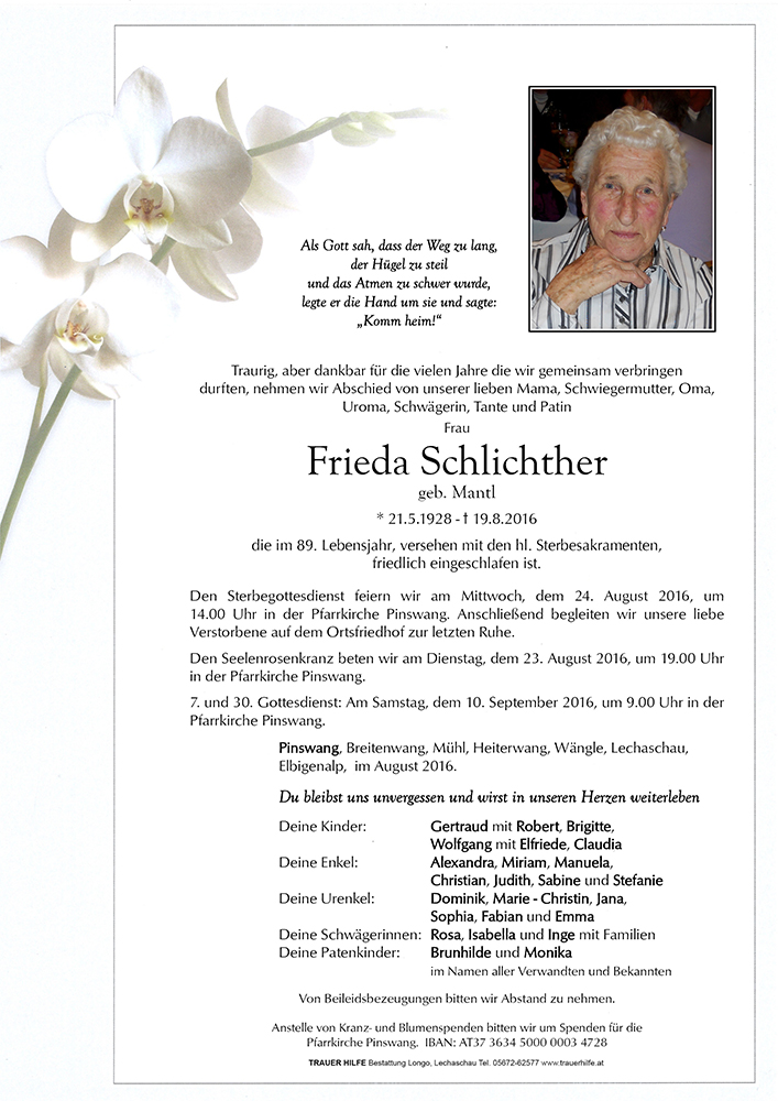 unser aufrichtiges Beileid zum Tode unserer "Pinswanger Oma", eurer Mama, Schwiegermutter, Oma und Uroma. Wir werden unsere liebe Frieda und Oma immer in gutem Gedächtnis bewahren und immer gerne an ihre freundliche, warme Art erinnern. Wir haben heute für Sie, in Pascals (ihrem besonderen Liebling) Namen eine Kerze angezündet. Natürlich auch eine für Opa und Markus. Wir wünschen Euch viel Stärke und Kraft für die Zukunft..