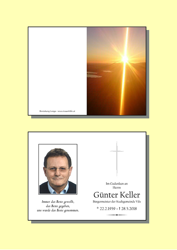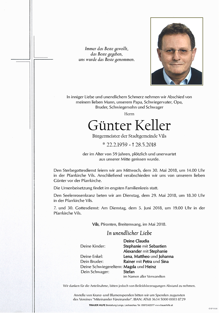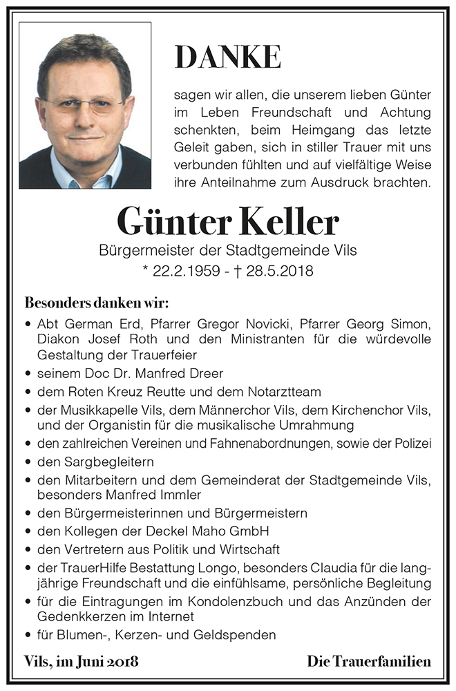 Mit großer Betroffenheit nehmen mein Mann und ich Abschied von Bürgermeister Günter Keller. Wir danken für seine großen Verdienste für die Städtepartnerschaft. Wir werden ihn stets dankbar erinnern. In aufrichtiger Anteilnahme, Birgit und Werner Seelbinder