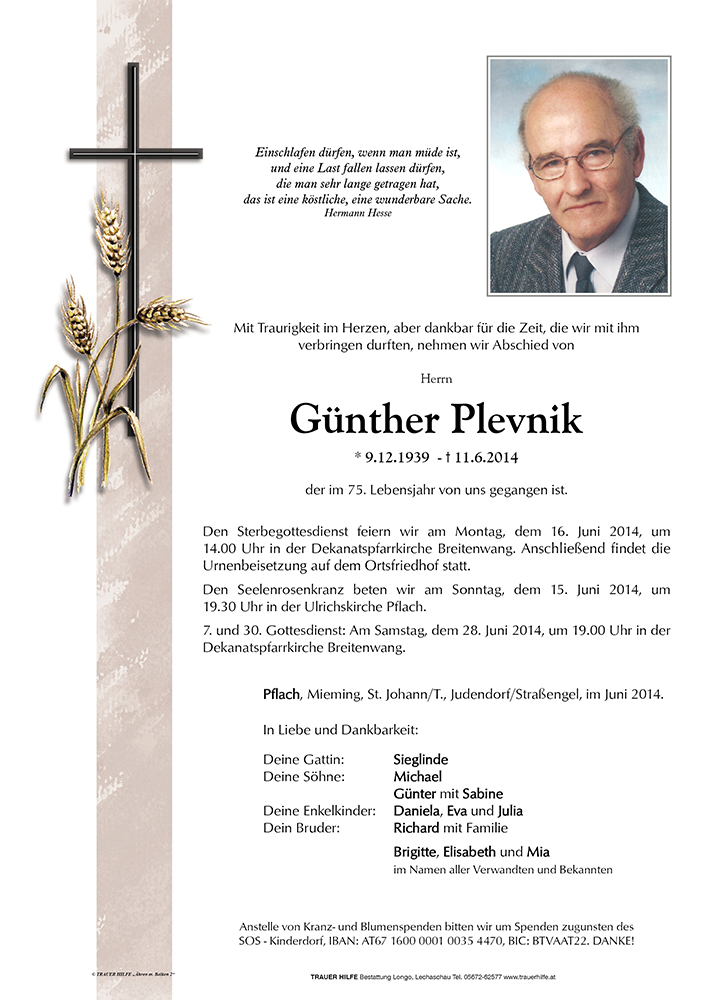 Liebe Sieglinde, lieber Michael, lieber Günther mit Familie, liebe Angehörige!