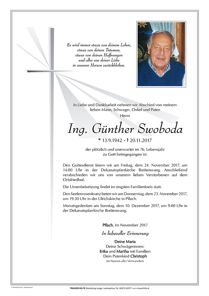 Unser Mitgefühl wird kaum Trost sein können und den Schmerz über den Verlust von Günther nicht mildern; es ist aber der bescheidene Versuch, Dir unsere aufrichtige Anteilnahme und Verbundenheit in diesen schweren Stunden zu zeigen.
