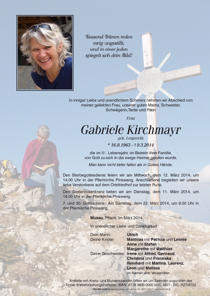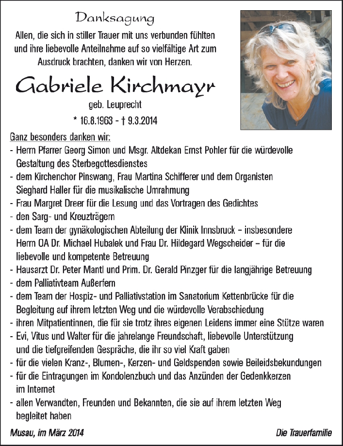 Das kostbarste Vermächtnis eines Menschen ist die Spur, die seine Liebe in unseren Herzen zurück gelassen hat (Vinzenz Erath). Die unendliche Liebe eurer Gabi für ihre Liebsten, für dich, Uli und eure drei Kinder war immer zu spüren und voll Wärme und aufrichtiger Bedingungslosigkeit - ihre Spuren werden unauslöschlich und irgendwann auch tröstend sein. Seid meiner aufrichtigen Anteilnahme versichert! Viel Kraft für die Zeit der Trauer und des Loslassens! Ulrike Millinger (Thurner) mit Familie