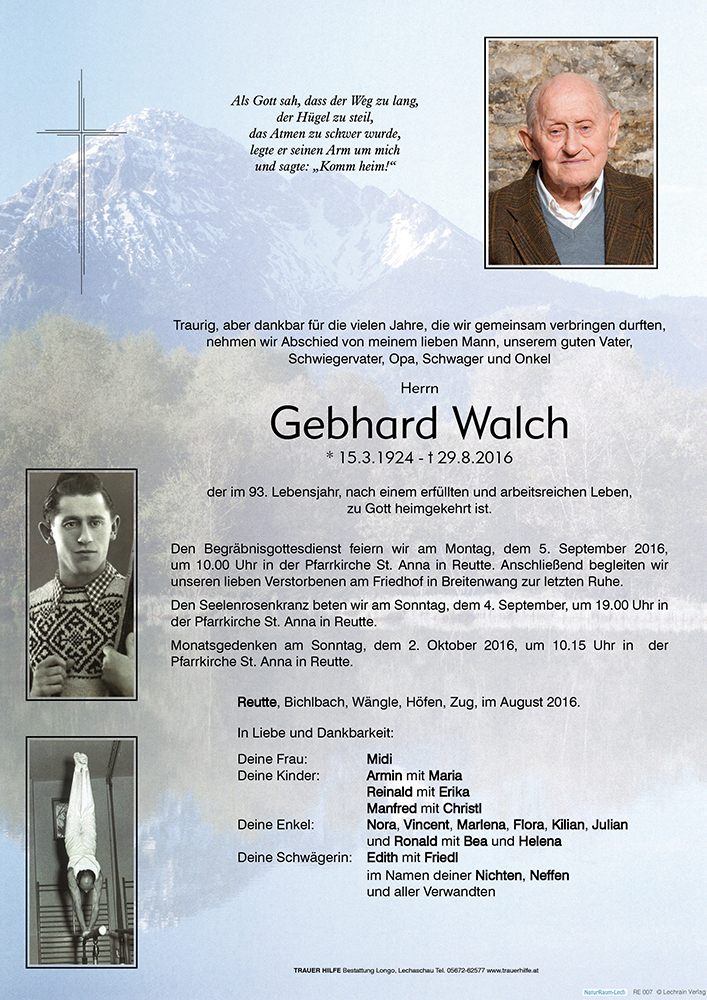 zum Heimgang von Gebhard möchte ich Euch auf diesem Wege mein herzlichstes Beileid ausdrücken. Ich hatte die Ehre und das Vergnügen von Gebhard in die hohe Schule des Reckturnens eingeführt zu werden. Ich habe viele Stunden am Reck im Garten der Walch\\\'s verbracht und war ganz stolz, als ich dann nach vielen intensiven Trainings - unter fachmännischer Beobachtung von Gebhard - in der Lage war, eine Kippe und einen Kreuzaufzug auszuführen. Auch war ich schwer beeindruckt und voller Begeisterung, wenn Gebhard hin und wieder zu Midi sagte: Midi rolle die Teppiche im Garten aus! Dann kamen wir in den Genuss, einen exzellenten Bodenturner bei seiner gewaltigen Bodenkür beobachten zu dürfen.