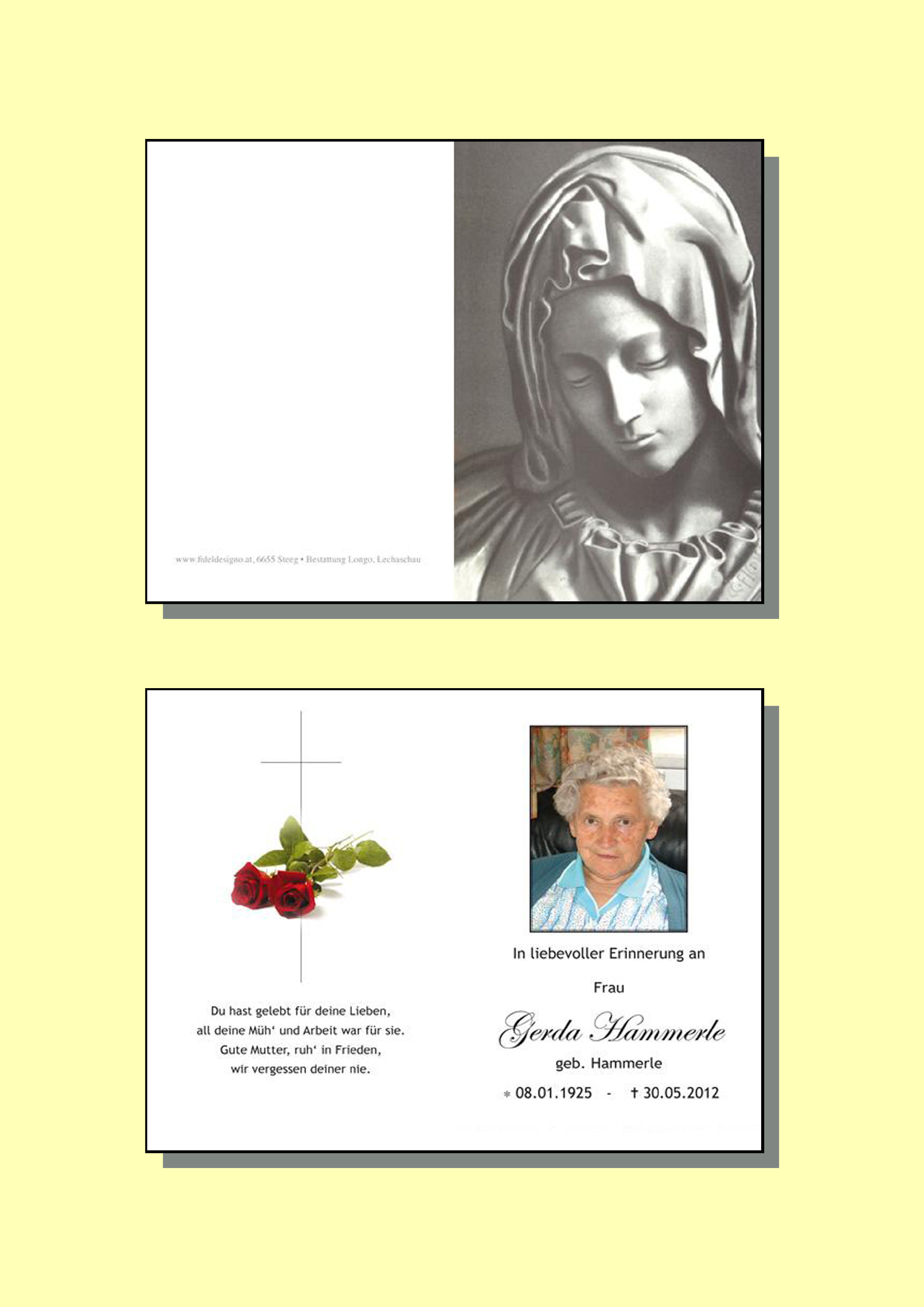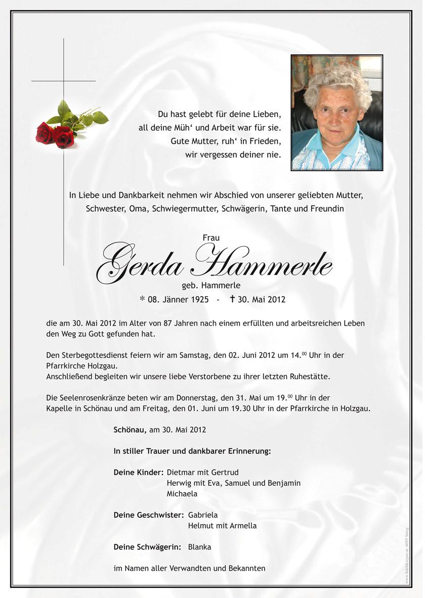 08.01.1925 30.05.2012 Schönau Gerda Hammerle Action Parte Sterbebild Gedenkkerzen Kondolenzen Parte Sterbebild Gedenkkerzen Kondolenzen Parte herunterladen Sterbebild herunterladen Gedenkkerzen für Gerda Hammerle 17 Einträge Kerze anzünden in stillem Gedenken Anita u. Klaus Jordan, Reutte Storf Silvia Harald u. Rosmarie Hammerle Hans & Christl Rossmann Knitel Maria Fam. Scharf Stockach Rainer und Silvia Wolf Fam. Karl und Marlies Hummel Fam. Glück Fam. Pfefferkorn Hägerau Esther mit Familie Knoll Anton mit Familie Gaby Reich m. Familie Fam. Hammerle, Steeg Walter und Hildegard Frey Fam. Hammerle Steeg Ihre Gedenkkerze fürGerda Hammerle Ihr Name* Farbe auswählen Ihre Nachricht oder Name* E-Mail-Adresse* Mit dem Klicken auf "Kerze anzünden" erklären Sie sich mit unseren Datenschutzbestimmungen einverstanden. Kondolenzbuch für Gerda Hammerle 0 Einträge Kondolenz verfassen Ihr Abschiedsgruß an Gerda Hammerle Ihr Name* E-Mail-Adresse* Ihre Nachricht* Mit dem Klicken auf "Gruß absenden" erklären Sie sich mit unseren Datenschutzbestimmungen einverstanden.