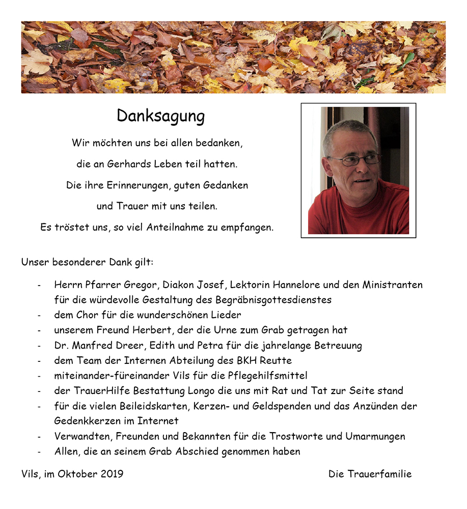 Möge es Euch in diesen schweren Stunden , Trost sein , Gerhard ist heimgegangen zu seinen Eltern .