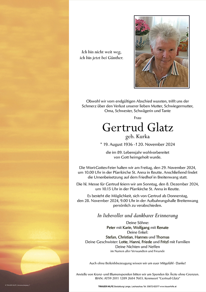 19.08.1936 20.11.2024 Reutte Gertrud Glatz Action Parte Sterbebild Gedenkkerzen Kondolenzen Parte Sterbebild Gedenkkerzen Kondolenzen Parte herunterladen Sterbebild herunterladen Gedenkkerzen für Gertrud Glatz 241 Einträge Kerze anzünden RIP.Werner und Karin Kößler ??✨ Zum Jahresgedenken In lieber Erinnerung, Susi Schwarzenbacher Zum Jahresgedenken Anna-Maria Tschiderer Denke an Euch Fam.Robert&Christine Pacher Susi Schwarzenbacher, Amsterdam Ruhe nun in Frieden Gerti. Silvia Thomas und Sabine Müller Susi Schwarzenbacher, Amsterdam Fam.Robert&Christine Pacher Walter & Brigitte Heel Inge Lechleitner Ruhe sanft in Gottes Hand - Christine Perle Regina und Daniel Kerle Walter & Brigitte Heel Fam.Robert&Christine Pacher Susi Schwarzenbacher, Amsterdam Thomas und Sabine Müller Tomek & Monique Gottfried Fasser, Reutte Ruhe in Frieden. Friedle Marion Rieden. Regina&Reinhold Feistenauer Wolfgang Dejaco Astrid&Martin Kaltenecker mit Familie Eva Wolf Fam. Lausecker Tiefes Mitgefühl, Ulli+Wolfgang Hechenberger Lisa, Felix & Wolfgang Simader Familie Hatzer Daniela Sulik Familie Taferner-Hassa Roman Schlichtherle und Angelika Friedl Franz Insam mit Familie Fam. Astrid und René Piechocinski Irmgard und Reinhard Beck Karl u . Marianne Hold Fam. Klaus u. Beate Schimana In lb. Gedenken Gerda u. Dietmar Schennach Fam.Maria&NorbertSyrow Sabine & Wolfgang Lipp mit Familie Christine und Reinhard Daniela Ginther Angela & Sabine Grubelnik Familie Jaindl Christa Wolf mit Fam. Andreas und Katharina Rumpf Peter Mittermayr mit Astrid Fam Bernd Kamper Fritz Kamper Fam. Sepp Paulweber Ruhe in Frieden Marlies_ Reyman Henrika Lagg Werner und Helga Angerlechner Angelika und Andreas Seidel Karl u . Marianne Hold Mit Segen und Gruß Bruder Werner Franz Josef Uschi Werth mit Familie Danke f.d.schöne Tenniszeit Fam. Harald Kaiser Gehring Petra Fam. Moosbrugger Fam. Santifaller Thomas Frick Daniela Rief m. Fam. Familie Klotz Goldene Rose Renate ✨?️ Fam. Brigitte & Hubert Dreer Klaus Wörle Ulrike & Alfred v. EaR Walter und Anita Falger Gerti & Adrian Eberhard Regina&Reinhold Feistenauer Mario und.Barbara Rief Christine Grasl Nadine und Christian Pohl Paul und Adele Strolz Fam. Andreas und Christina Wiesenegg Maria und Wolfgang Zangerl Uli Schädler Familie Bernhard und Barbara Retter Fam. Wolfgang Haissl Manuela und Harald Juen Fam. Paul & Konni Nessler Anne Sandra Koch Fam. Premrou -Lochbihler Michael Koch mit Familie Johannes und Sonja Gomig Ernst und Sibylle Geiger Margit Ralser Singer Marion Ingrid, Wolfgang und Robert Elkner Gitti Unterkofler Barbara und Klaus Wankmiller Fam. Walter und Annelies Kerber Familie Anton Specht Wolfgang und Marina Anschitz Ruhe sanft in Gottes Hand - Christine Perle Ralph Kunze mit Familie Uli und Oskar Wetzel Ladner Charlotte Claudia Moosbrugger Silvia Sonnweber Fam.Stefan Beirer Christoph und Evelyn Weirather Gertrud und Maria Pohler Fam. Kerber Walter Evi Lorenz Brigitte und Alex Brunnsteiner Helga mit Familie Gerhard und Gabi Bacher Bernadette u.Lothar Reinstadler Manfred und Eveline Pfeifer Paul Huemer Christine Raffl Fam.Eberharter Peter und Anita Fam. Gundolf Andrea und Sepp Ursula und Gerd Huter Laura Beck mit Familie Marianne & Peter Schautzgy Ernst J. Messmer & Kirsten Fam. Franz und Herta Walcher ruhe in Frieden, Elisabeth Lipp Reinhold Jenul Fam. Johannes und Gudrun Baumann Günter Koch Viktoria & Daniel Dannhäuser Fam. Peter und Daniela Singer Heinz Thurner Herwig und Christine mit Familie R.I.P. Peter Wartusch Christine Brunnsteiner Wolfgang und Eugenie Puntigam Michaela und Karlheinz Ginther Christine Friedl Gerfried und Sieglinde Breuss Heidi Sörgel Fam.Peter&Claudia Madlberger Thomas Melekusch mit Familie Markus Ebentheuer und Andrea Drexel Fam. Hannes und Barbara Pirschner Fam. Daniela und Peter Singer Helly und Monika Kraus Katrin & Roland Astl Franz & Gudrun Pohler Manfred und Nicole Bacher In stillem Gedenken OSR Richard Wasle Ernst und Christa Saalfrank Eugen Winkler sen. Paul und Ida Kerber mit Familie?R.I.P. Sabina Beirer Hilde Hosp Fam. Joe & Babsi Vögele Christian Tschiderer Seniorenzentrum Haus zum guten Hirten Dreer Norbert Ruhe in Frieden Andreas Koch Maria Petrini Elmar und Roswitha Fuchs Ein Licht aus Ehrwald Brigitte und Helmut Claudia Grißmann Regina und Daniel Kerle Familie Klimesch Familie MEẞMER Gerhard & Ingrid Michaela & Herbert Suitner Hans Sörgel mit Familie Gerlinde Hengg mit Familie Fam. Klaus und Petra Eberle Karin Steven mit Familie Petra und Arno Schintlmeister Gerda Wagner mit Familie Rosmarie und Andrea Grubmüller Bettina Leuprecht Sonja Fuchs mit Familie Anita Walch-Lang Fam. Beate & Patrick Koch Fam.Robert&Christine Pacher Gerda Habicher mit Linda Susi Schwarzenbacher, Amsterdam Gabi Sailer Claudia, Ernst, Andreas und Lukas Fam. Gerhard Wechner Margit Dablander Manuela und Herbert Praxmair Fam. Jörg & Marlies Brejcha ? Edi Kotz und Marianne Scheiber Gustl und Monika Ihrenberger Ursula Leuprecht Fam. Hans-Peter Höfler Peter und Elsbeth Zobl Walter und Angelika Familie Eva-Maria und Günter Walch Fam. Harald Grubelnik Silvia und Egon Okorn Ingrid u. Reini Gruber? Ruhe in Frieden Heidrun und Michael Andreas & Kathrin Lechner Christine Plosinjak m.Fam RIP.Werner und Karin Kößler ?? Margit und Johann Fasser Fam. Tautermann Fick Renate Claudia und Günther Reichel Fam . Alexandra & Günther Mair Fam. Michaela Weber In lieber Errinerung Anna-Maria Tschiderer Paul Seitz mit Familie Fam. Edi u. Margrit Ammann Margarete und Emmerich Lutz Andrea und Kurt Hohenrainer Fam . Günther Haberl Zdenko und Ulli Busic Thomas und Sabine Müller Verena Scheucher Fam. PetraSteinhart-Häsele Karin Gruber Peter und Christine Müller Team Dr.Nahler Gute Reise ? Günther & Liz Ihrenberger, Oberösterreich Ruhe in Frieden Pepi Kogler Christian & Daria Larcher ? Maria Bader, Reutte Gabi Rief mit Familie Fam. Martina & Dietmar Storf Johannes, Petra, Jakob und Linda Familie Manfred Gutmann, Reutte Brigitte und Reinhold Zach Waltraud Santer Johann