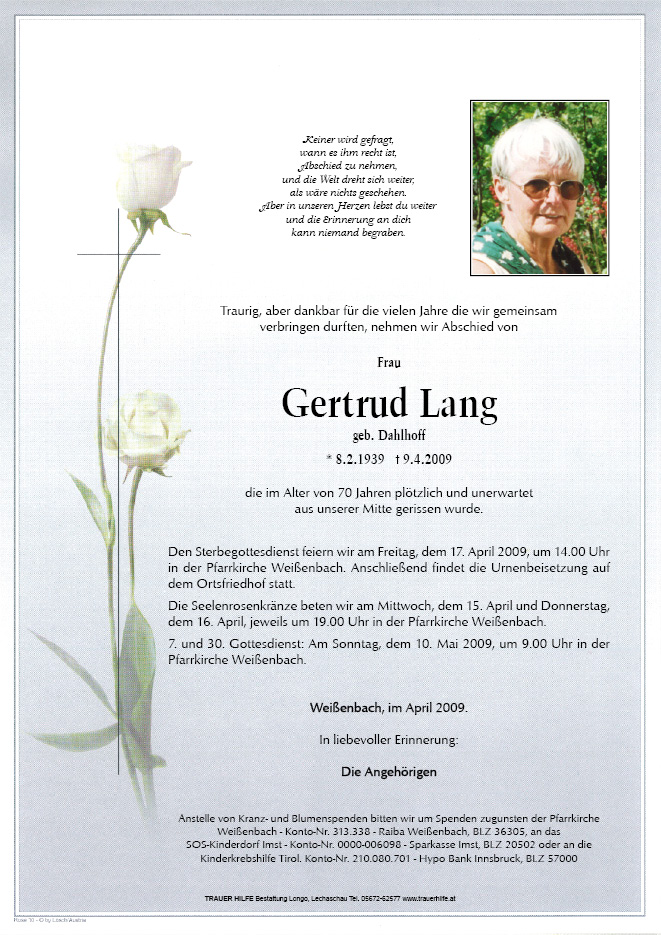 13.12.1901 09.04.2009 Weißenbach am Lech Gertrud Lang Action Parte Gedenkkerzen Kondolenzen Parte Gedenkkerzen Kondolenzen Parte herunterladen Gedenkkerzen für Gertrud Lang 2 Einträge Kerze anzünden In stillem Gedenken, Silvia Familie Elisabeth Kerle Ihre Gedenkkerze fürGertrud Lang Ihr Name* Farbe auswählen Ihre Nachricht oder Name* E-Mail-Adresse* Mit dem Klicken auf "Kerze anzünden" erklären Sie sich mit unseren Datenschutzbestimmungen einverstanden. Kondolenzbuch für Gertrud Lang 0 Einträge Kondolenz verfassen Ihr Abschiedsgruß an Gertrud Lang Ihr Name* E-Mail-Adresse* Ihre Nachricht* Mit dem Klicken auf "Gruß absenden" erklären Sie sich mit unseren Datenschutzbestimmungen einverstanden.