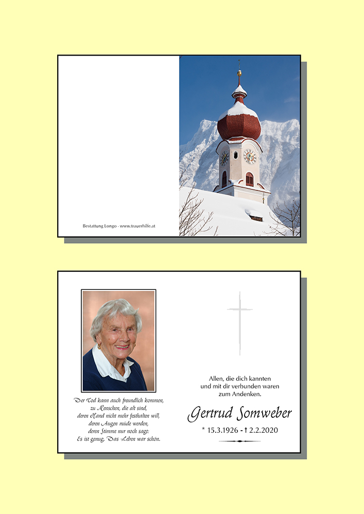 In den letzten Monaten konnte ich dank deiner Erzählungen deine liebe Tante gedanklich etwas begleiten. Deine Tante Gertrud hat ja deine regelmäßigen Besuche sehr geschätzt und sich darüber sicher sehr gefreut. Deine Tante hatte mit ihrer Krankheit ein schweres Los zu tragen, obwohl sie eine lebenslustige, fröhliche und sportliche Frau war. Der Herrgott hat für sie mit Sicherheit ein wunderbares Platzl bereitgestellt- gönnen wir deiner Tante die Ruhe und himmlischen Frieden.