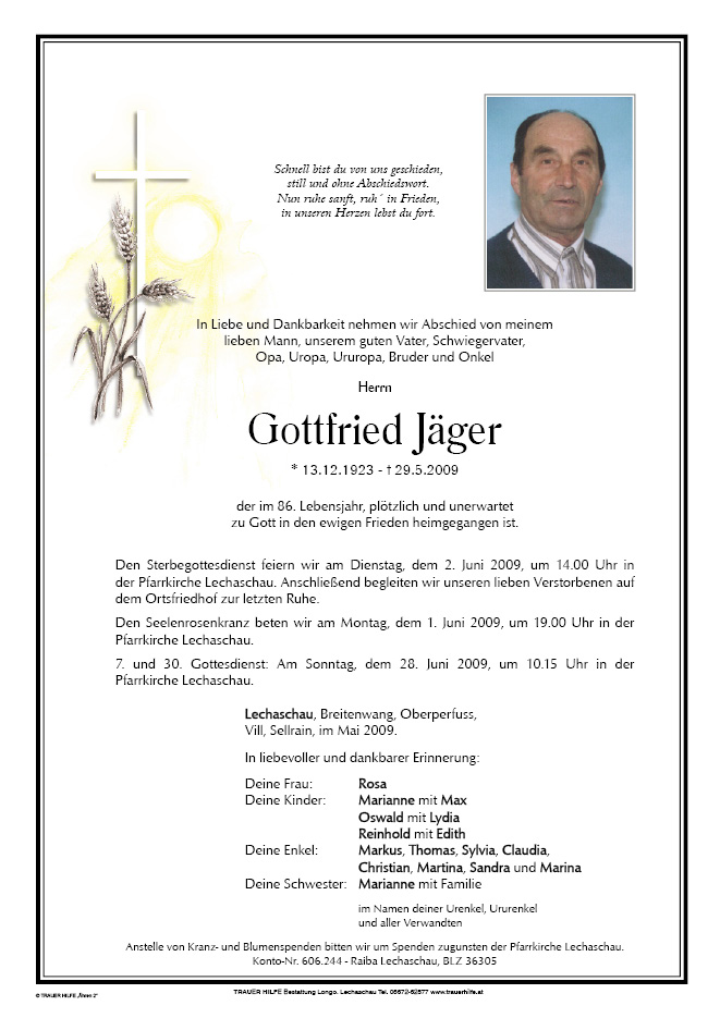 13.12.1901 29.05.2009 Lechaschau Gottfried Jäger Action Parte Gedenkkerzen Kondolenzen Parte Gedenkkerzen Kondolenzen Parte herunterladen Gedenkkerzen für Gottfried Jäger 2 Einträge Kerze anzünden R. I. P Felix für dich Ihre Gedenkkerze fürGottfried Jäger Ihr Name* Farbe auswählen Ihre Nachricht oder Name* E-Mail-Adresse* Mit dem Klicken auf "Kerze anzünden" erklären Sie sich mit unseren Datenschutzbestimmungen einverstanden. Kondolenzbuch für Gottfried Jäger 0 Einträge Kondolenz verfassen Ihr Abschiedsgruß an Gottfried Jäger Ihr Name* E-Mail-Adresse* Ihre Nachricht* Mit dem Klicken auf "Gruß absenden" erklären Sie sich mit unseren Datenschutzbestimmungen einverstanden.