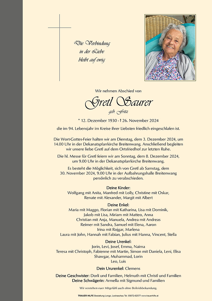 Zum Ableben von Frau Gretl Saurer möchten wir Ihnen auf diesem Weg unser MitgefĂŒhl ausdrĂŒcken.