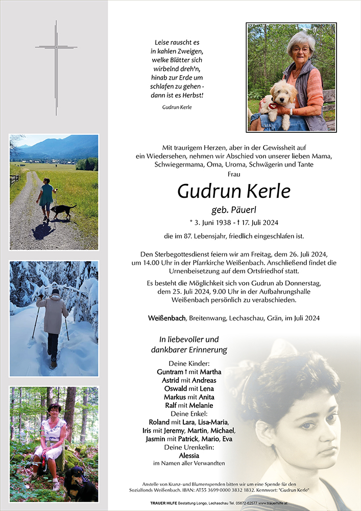 Liebe Gudrun, ich habe dich als sehr feinsinnigen und herzlichen Menschen gekannt. Auch wenn du schon als kleines Kind die Härte des Krieges kennen gelernt und schwere Schicksalsschläge durchgestanden hast, hast du dein Leben aktiv gestaltet und feinen Sinn für das Schöne nicht verloren . Dein ganzes Herz galt deiner Familie.