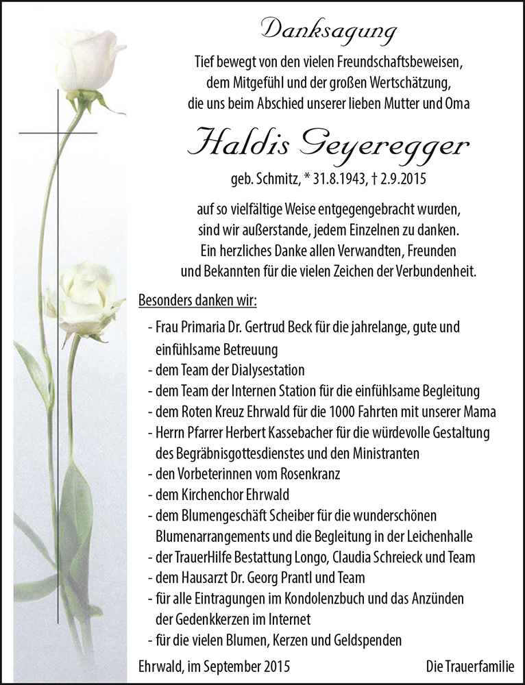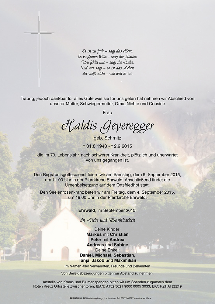 Haldis war ein ganz besonderer Mensch. So jemand kann nicht sterben. Ihr großes Herz lebt in Euch weiter.