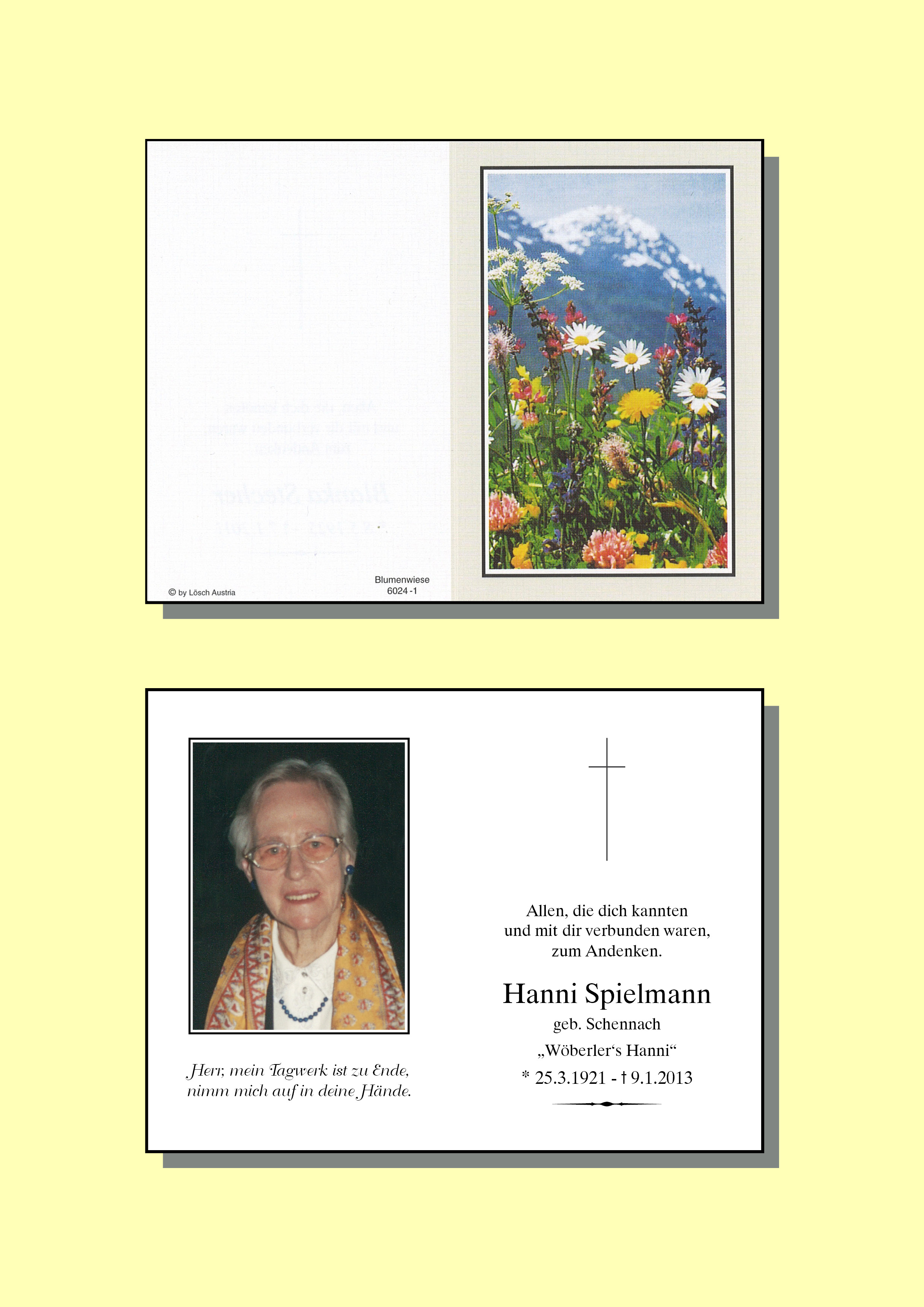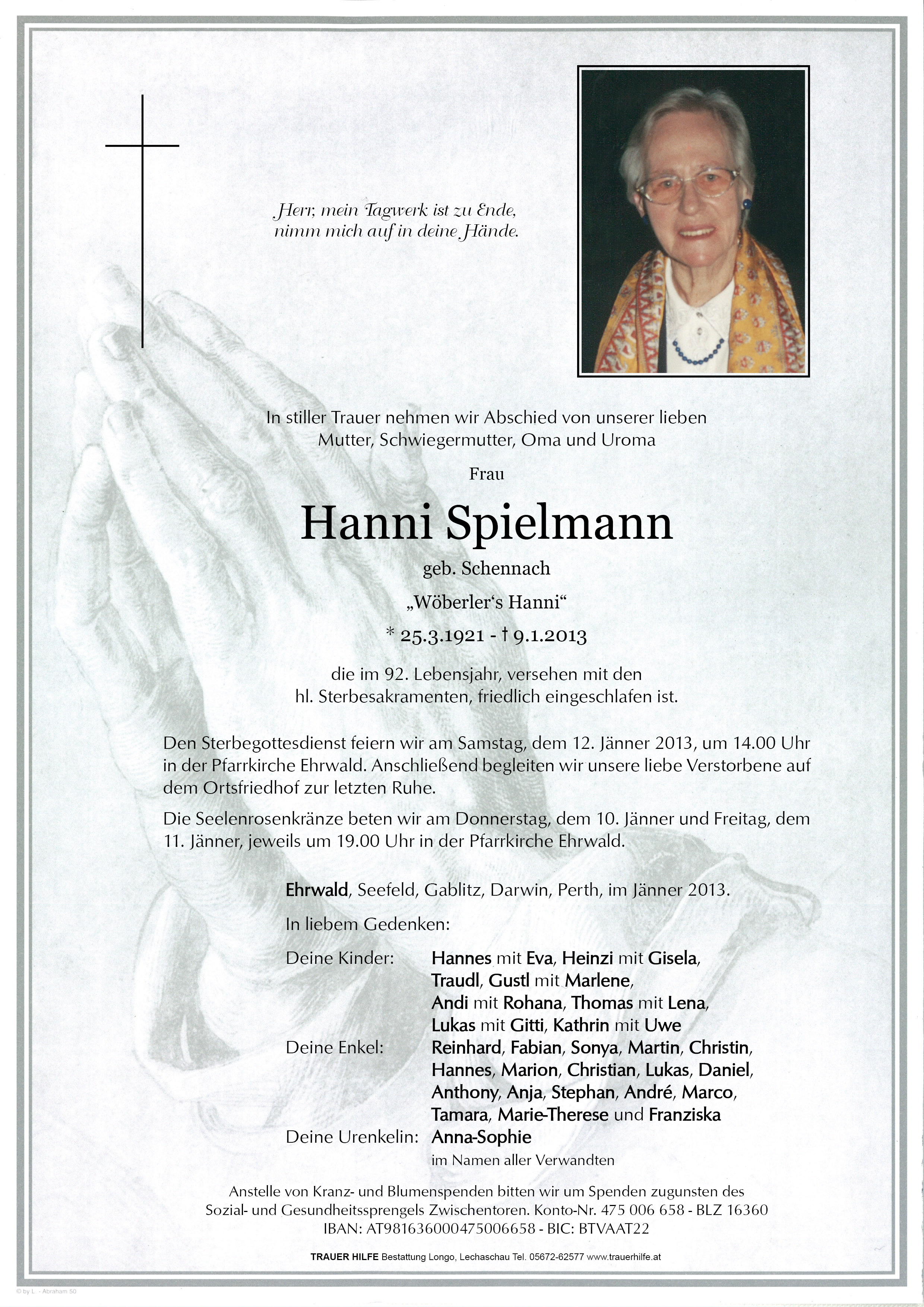 Liebste Hanni! Ich war Dein und Väterchen Arturs neuntes Kind und die Tante Gerda - vor der ich einst als Kind ein wenig Angst hatte - auch sie gab mir immmer das Gefühl angekommen und daheim zu sein! Ich habe Euch und unser Ehrwald so sehr geliebt, daß mir bei jeder Abreise entsetzlich weh zumute war, wie Du weißt! Über viele Jahre hinweg, waren wir Vertraute in Philosophie und Phantasie und kannten keine Grenzen. Nun habe ich Euch alle verloren und dennoch, als ich mit Deiner ältesten Tochter heute sprach, fühlte ich die Kraft Eurer Familie und ich bin fest davon überzeugt - Traumelinchen denkt bestimmt genau wie ich - , daß die Liebe niemals ein Ende findet und in dieser Hoffnung auf die Ewigkeit werde ich für immer bei Euch und meinen Altvorderen sein! Ich kann zwar nicht schlafen, weil ich unserer Zeiten unter dem Apfelbaum auf dem Anger und dem Vertrauen untereinander gedenke, aber ich werde mich redlich bemühen, Dich und Tante Gerda, freizulassen - in der Hoffnung, daß sich die Liebe, immer und ewiglich durchsetzen möge! Denke immer an den Martinstag mit Väterchen in unserer kleinen Kapelle am Platz - so wird es immer sein! In Liebe: Deine Annette P.S.: Der Thilo denkt auch ganz stark an unsere Zeit!