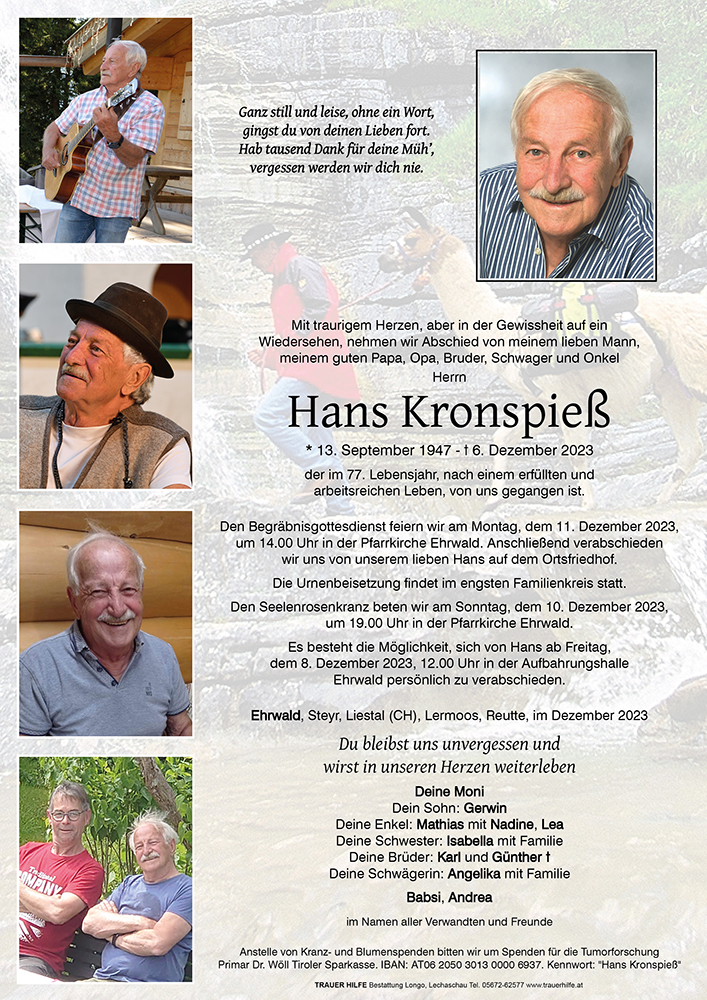 Eurer Familie wünsch wir viel Kraft um den starken Verlust zu verkraften. Mit Hans ist für uns Touris aus Speyer leider ein Stück Ehrwald verloren gegangen.