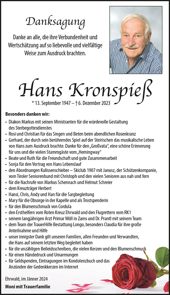 Zum Tod von Hans möchten wir unsere aufrichtige Anteilnahme aussprechen.