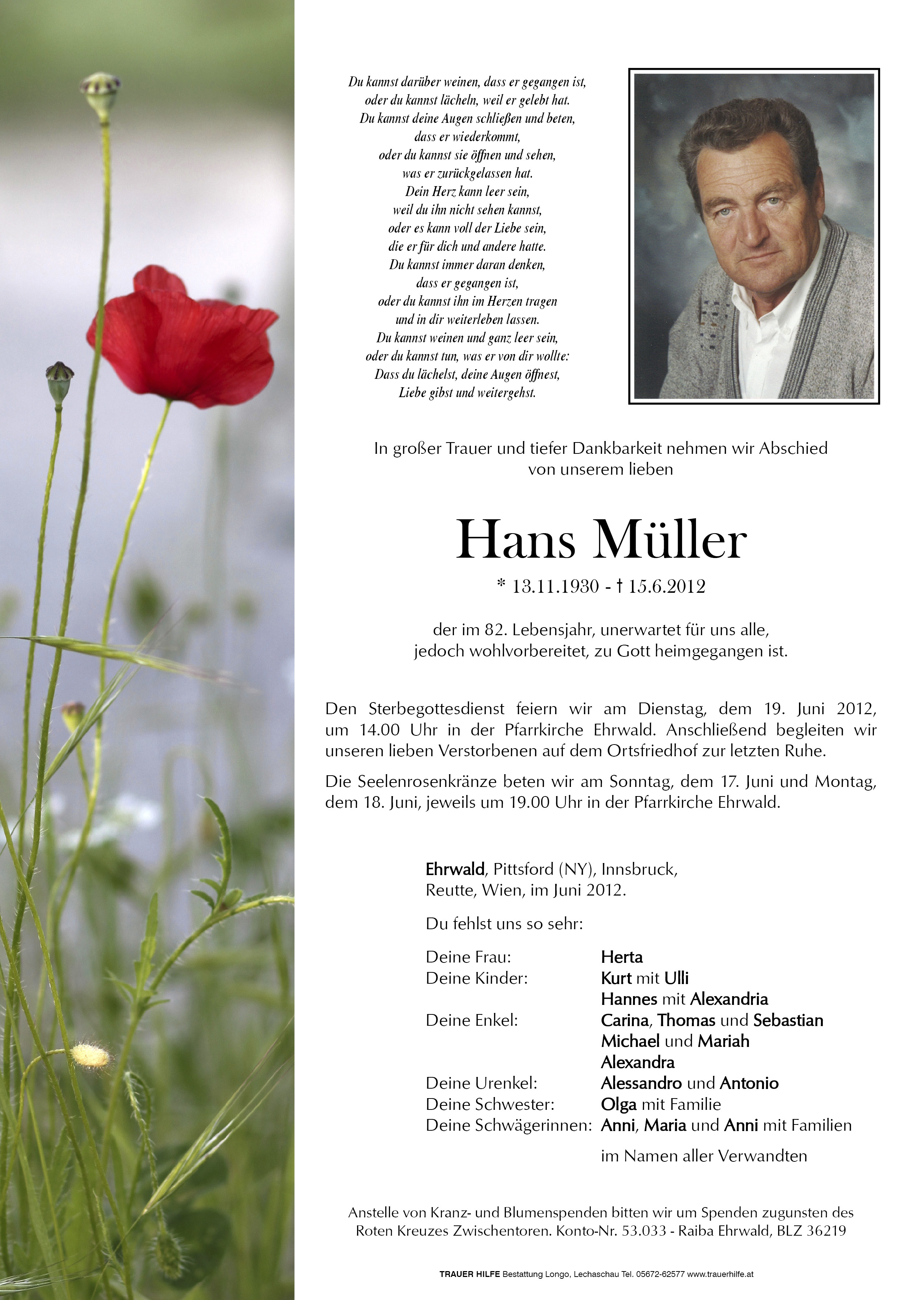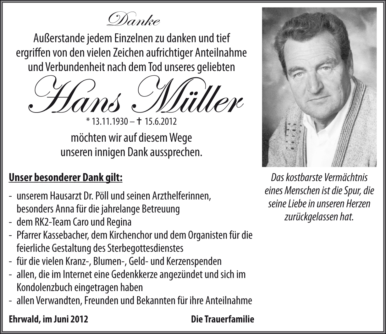 Wir sind sehr traurig, das Hans nicht mehr bei uns ist und werden Ihn vermissen. Dich Hertha und deine Buben möchten wir auf diesem Weg viel Stärke und Kraft wünschen. Eure Nachbarn Kieke und Hansjörg