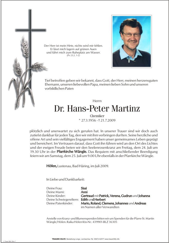 Kondolenzbuch für Hans-Peter Dr. Martinz
