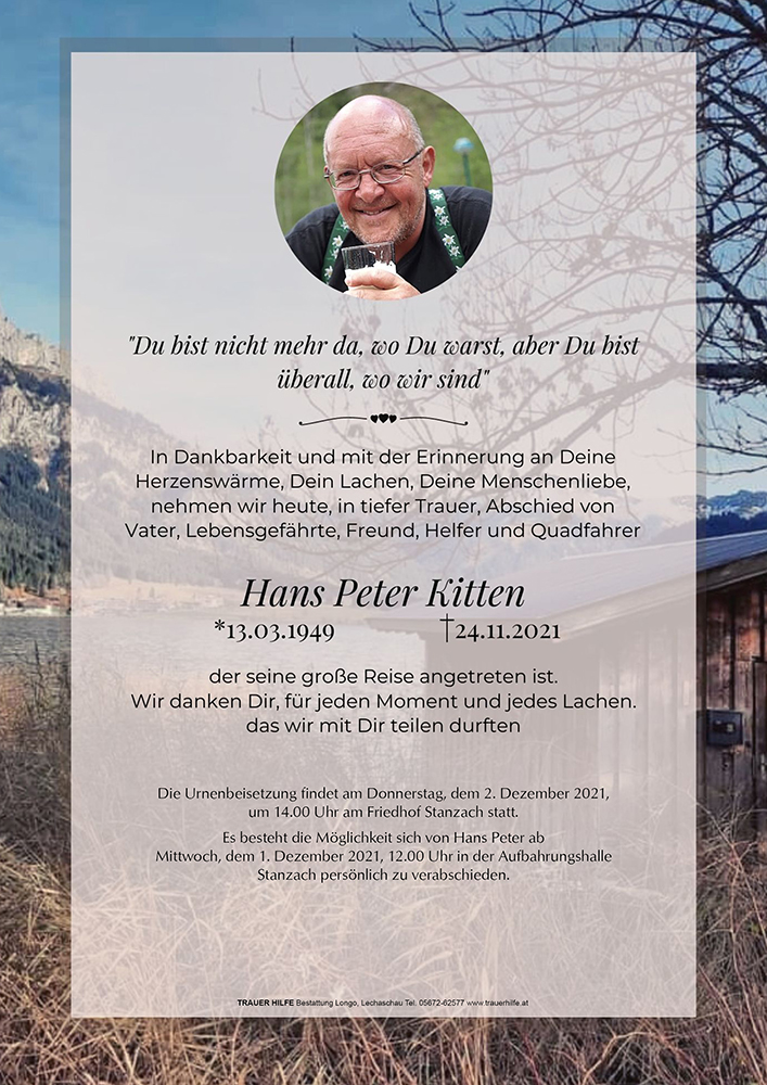 13.03.1949 24.11.2021 Stanzach Hans Peter Kitten Action Parte Gedenkkerzen Kondolenzen Parte Gedenkkerzen Kondolenzen Parte herunterladen Gedenkkerzen für Hans Peter Kitten 38 Einträge Kerze anzünden Fam. Maldoner-Jäger Gerhard + Gudrun Ruhe sanft Fam. Susanne u. Hanspeter Außerhofer Danke für deine Herzlichkeit Anja Ingrid Perktold Mario und. Barbara Rief Ein Licht aus Höfen Aufrichtige Anteilnahme! Erika Petz-Mattes Wilfried Zotz Erwin Falger Annemarie & Bruno HAUG Dagmar Haider Ernst Zotz Ruhe sanft Wir sind traurig Seppl & Dagmar SPRENGER Verena Scheucher Herbert Gapp Ruth Helbock mit Bernd und Jakob Eine Kerze aus Reutte Christina Rimml Familie Anton Specht Fam. Stefan Beirer Erika Bilgeri Dagmar Winkler Brunhilde aus Nesselwängle Monika u. Hans-Peter Höfler Manfred und Claudia Fam. Ernst und Magdalena Spitzer Sandra Wanner m. Fam. Fam. Bernd und Carola Spitzer Fuchs Brigitte Heike und Eddy Preisser Jenny Preisser und Christoph Lechleitner Susanne Lutz Claudia Schreieck TrauerHilfe Bestattung Longo Ihre Gedenkkerze fürHans Peter Kitten Ihr Name* Farbe auswählen Ihre Nachricht oder Name* E-Mail-Adresse* Mit dem Klicken auf "Kerze anzünden" erklären Sie sich mit unseren Datenschutzbestimmungen einverstanden. Kondolenzbuch für Hans Peter Kitten 1 Eintrag Kondolenz verfassen Wir sind nur Gast auf Erden und wandern ohne Ruh‘ mit mancherlei Beschwerden der ewigen Heimat zu. Ruhe in Frieden 01.12.2021 um 10:51 Uhr Ihr Abschiedsgruß an Hans Peter Kitten Ihr Name* E-Mail-Adresse* Ihre Nachricht* Mit dem Klicken auf "Gruß absenden" erklären Sie sich mit unseren Datenschutzbestimmungen einverstanden.