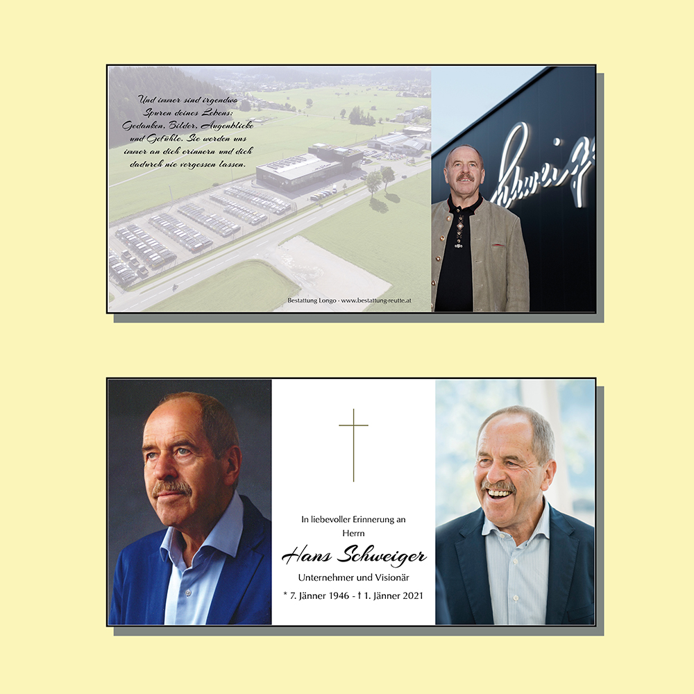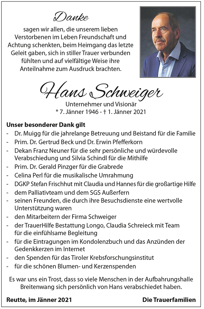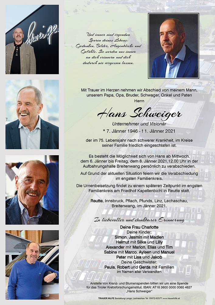 Hans Schweiger hinterlässt eine Lücke weit über die Unternehmensgrenzen der Firma Schweiger hinaus. Der Tod von Hans ist nicht nur für eure Familie, sondern auch für den gesamten Bezirk ein sehr großer Verlust.