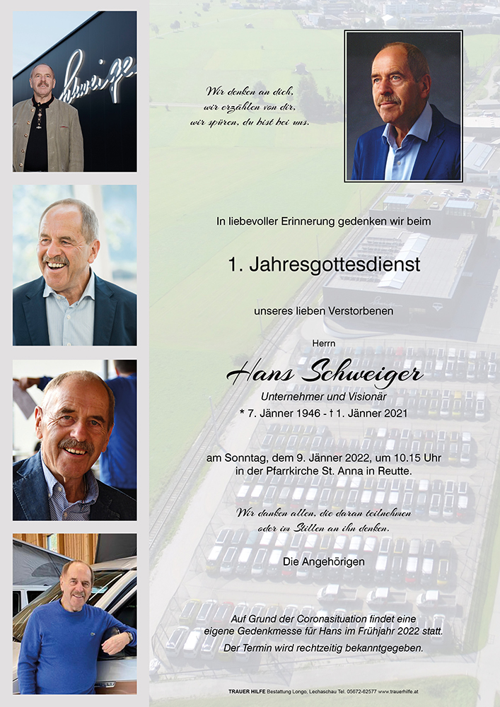 Mein Beileid den Angehörigen des Hans. Er war einer der Besten und redlichsten Kaufleute im Bezirk. Alle unsere Audis A3 und A4 kamen von ihm. Ein echter Visionär und toller Geschäftsman. R.I.P. Hans Schweiger und einen schweigenden Händedruck aus den USA den Hinterbliebenen.
