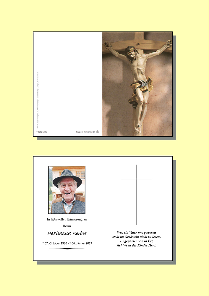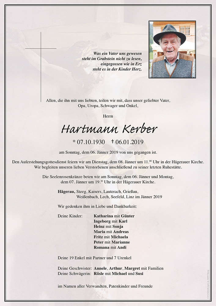 Aufrichtiges Beileid an alle Familien Kerbers zum Heimgang unseres lieben Onkels Hartl entbieten Nichten Margit, Maria und Irma mit Fam.