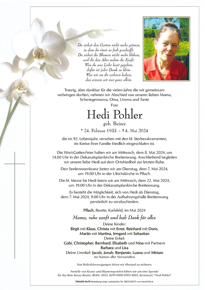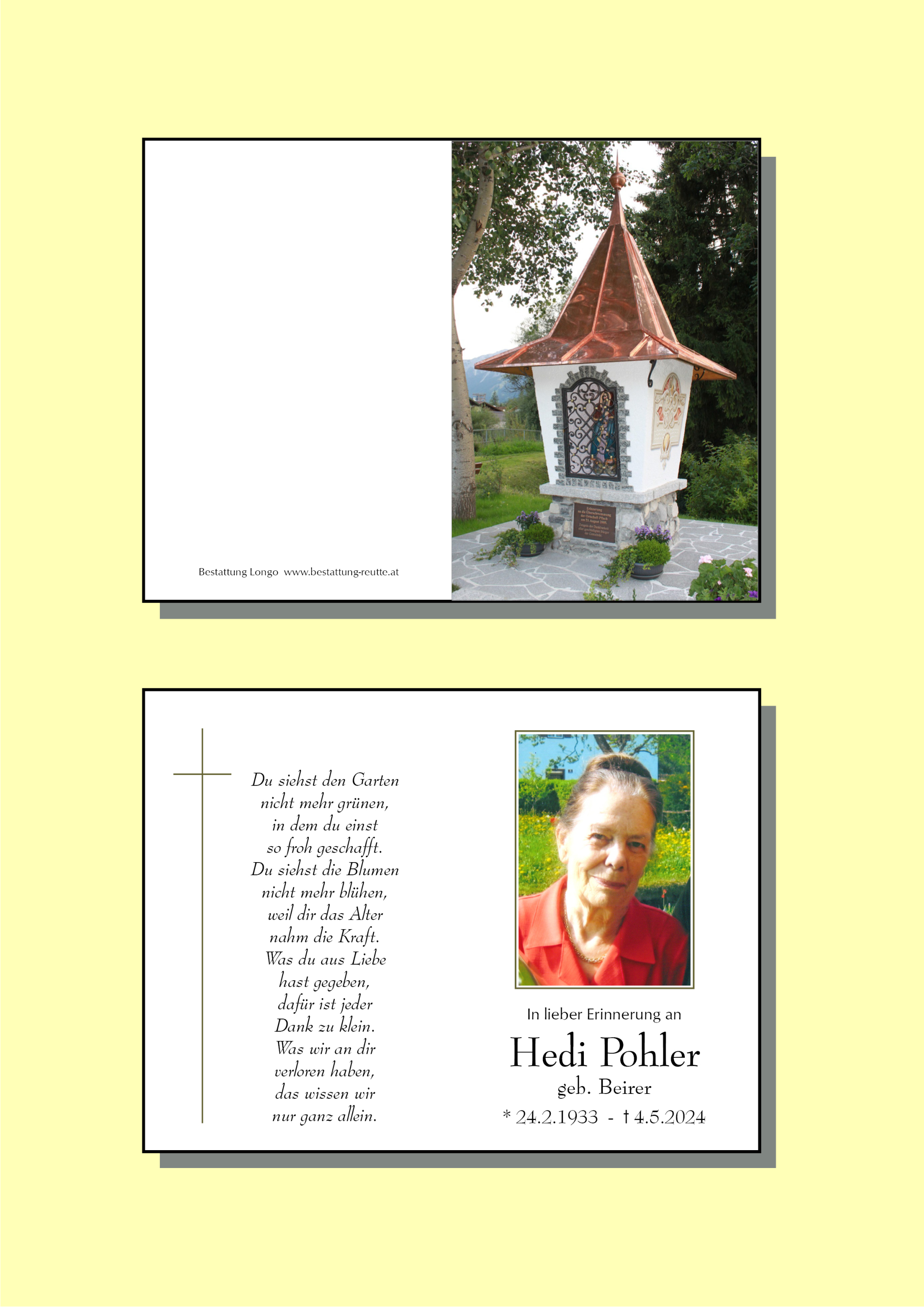 Ich möchte euch meine aufrichtige Anteilnahme am Heimgang von Hedi entbieten und wünsche euch in dieser schweren Zeit des Abschieds, des Loslassens und der Trauer ganz viel Kraft.