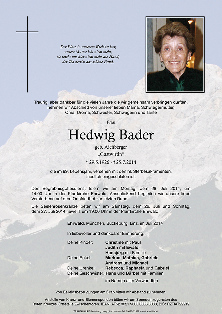 Hedwig verstorben ist. Nicht nur ihr, sondern auch wir haben einen liebgewonnenen Menschen verloren, der bei jedem Besuch in Ehrwald für uns Anlaufstelle war.
