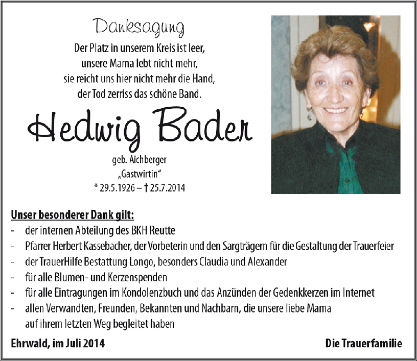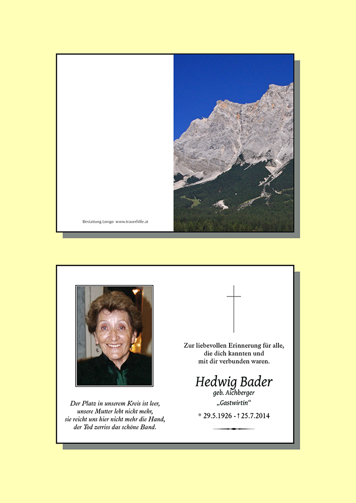 Kondolenzbuch für Hedwig Bader