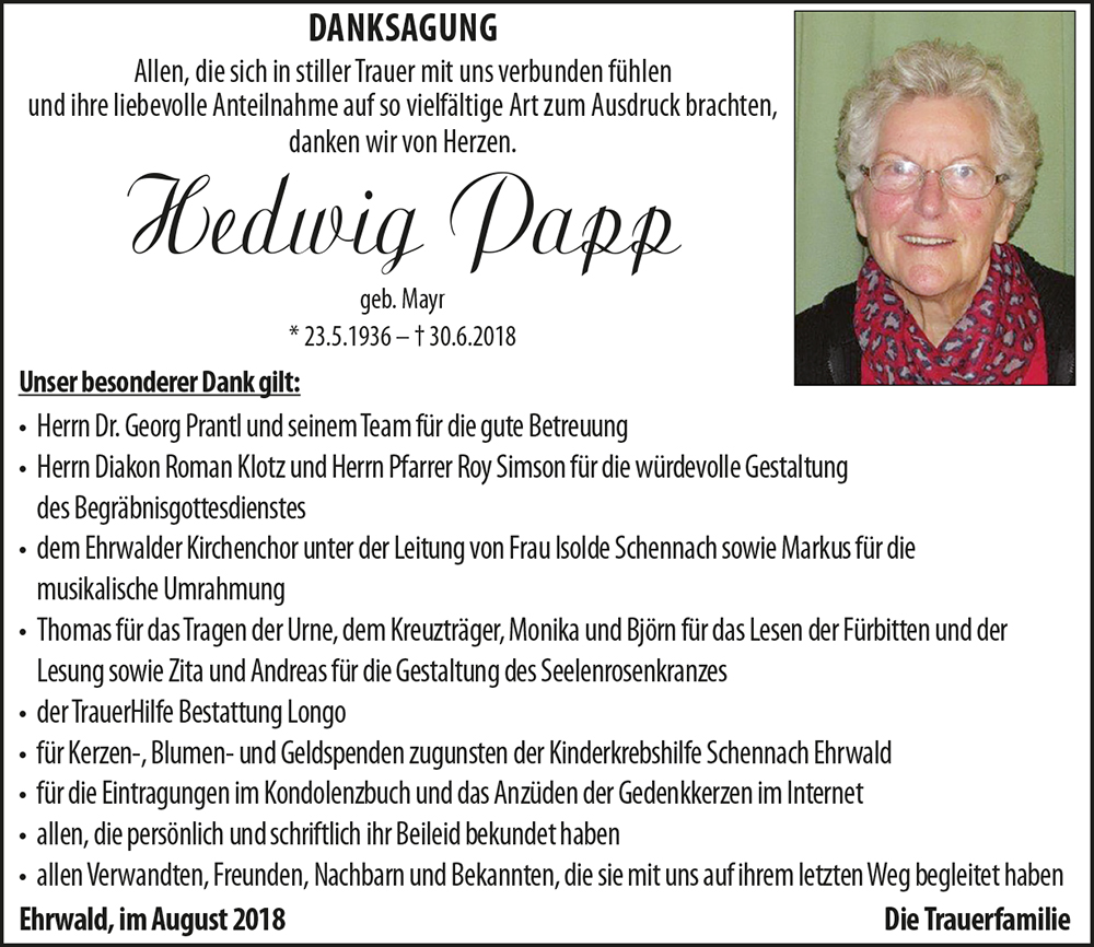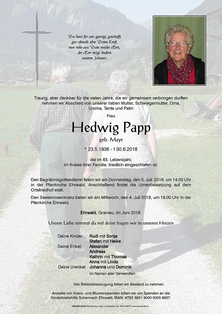 Wir werden Hedi vermissen. Möge sie in Gottes Geborgenheit leben.
