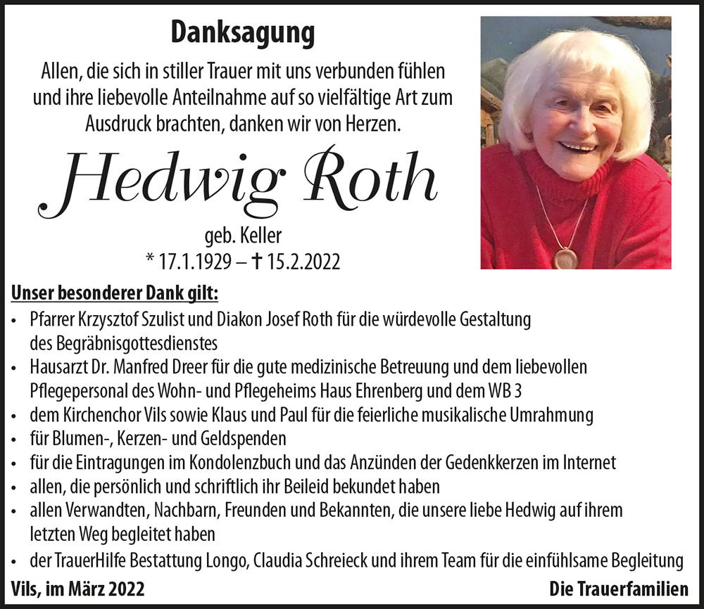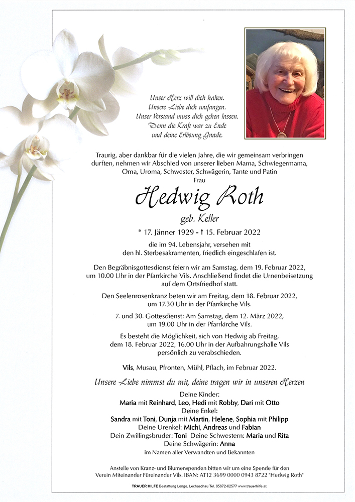 Traurig mussten wir zu Kenntniss nehmen, dass Eure so innig geliebte Mama Hedi, welche wir über einen längeren Zeitraum als Pflegeteam in Nassereith begleiten durften, für immer die Augen geschlossen hat - ihr Strahlen , ihre pointenreichen Bemerkungen u. ihr von ihrem Leben geprägte Persönlichkeit haben ihre Mitbewohner u. uns ihr ehemaliges Pflegeteam oft zum Lachen gebracht u. ist heute noch Inhalt mancher Gespräche - ihr ihre Kinder ward trotz ihrer Erkrankung immer im Vordergrund- seit ihr gekommen, schien ihre Welt in Ordnung zu sein - eure Liebe u. Fürsorge für eure Mama war beispielhaft u. inspirierend - möge euch in dieser schweren Zeit der Trauer u. des Abschieds, das Wissen darum, dass ihr immer Alles gegeben habt um für eure Mama da zu sein u. ihr immer das Beste für sie wolltet , Trost u. Kraft geben .