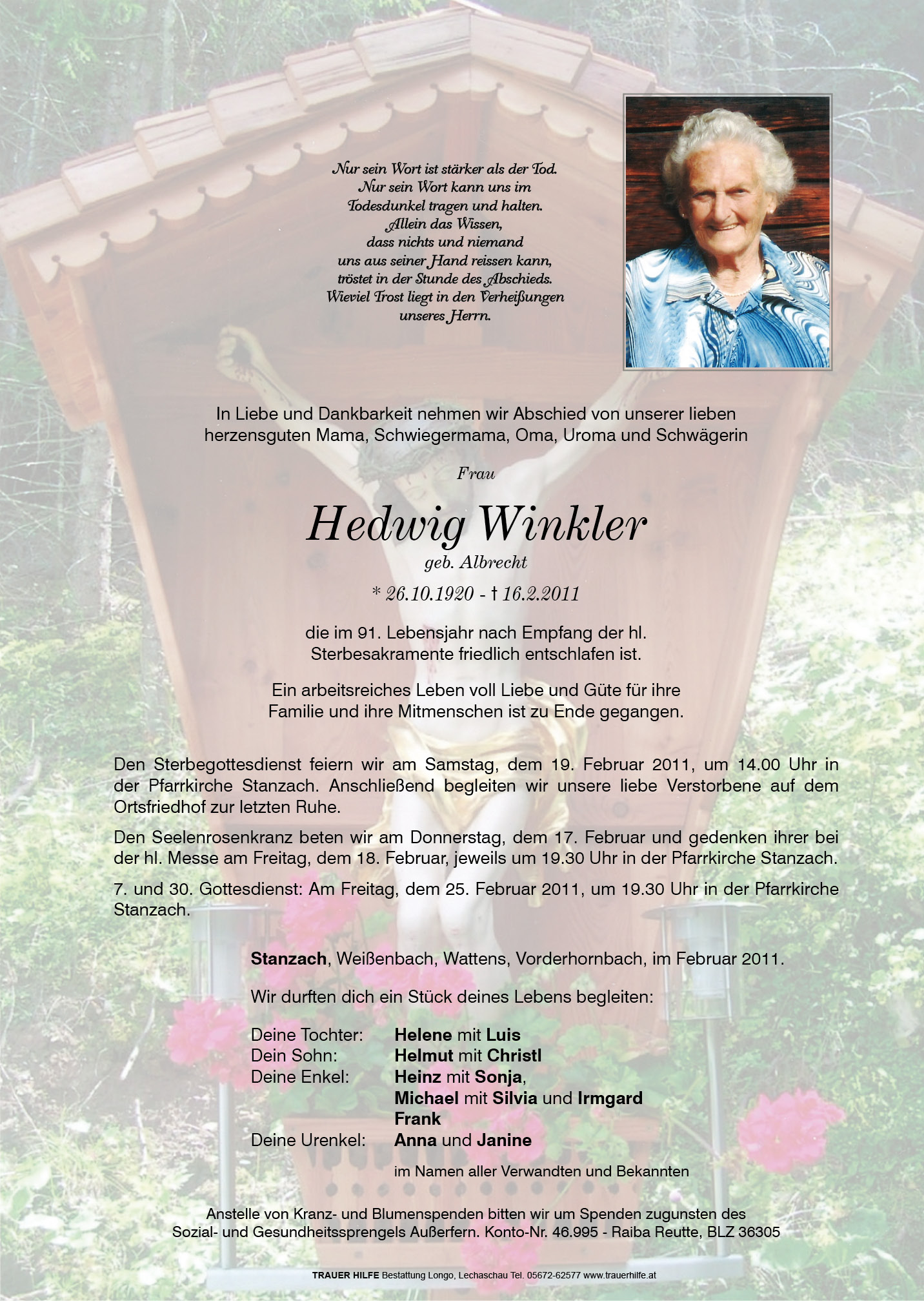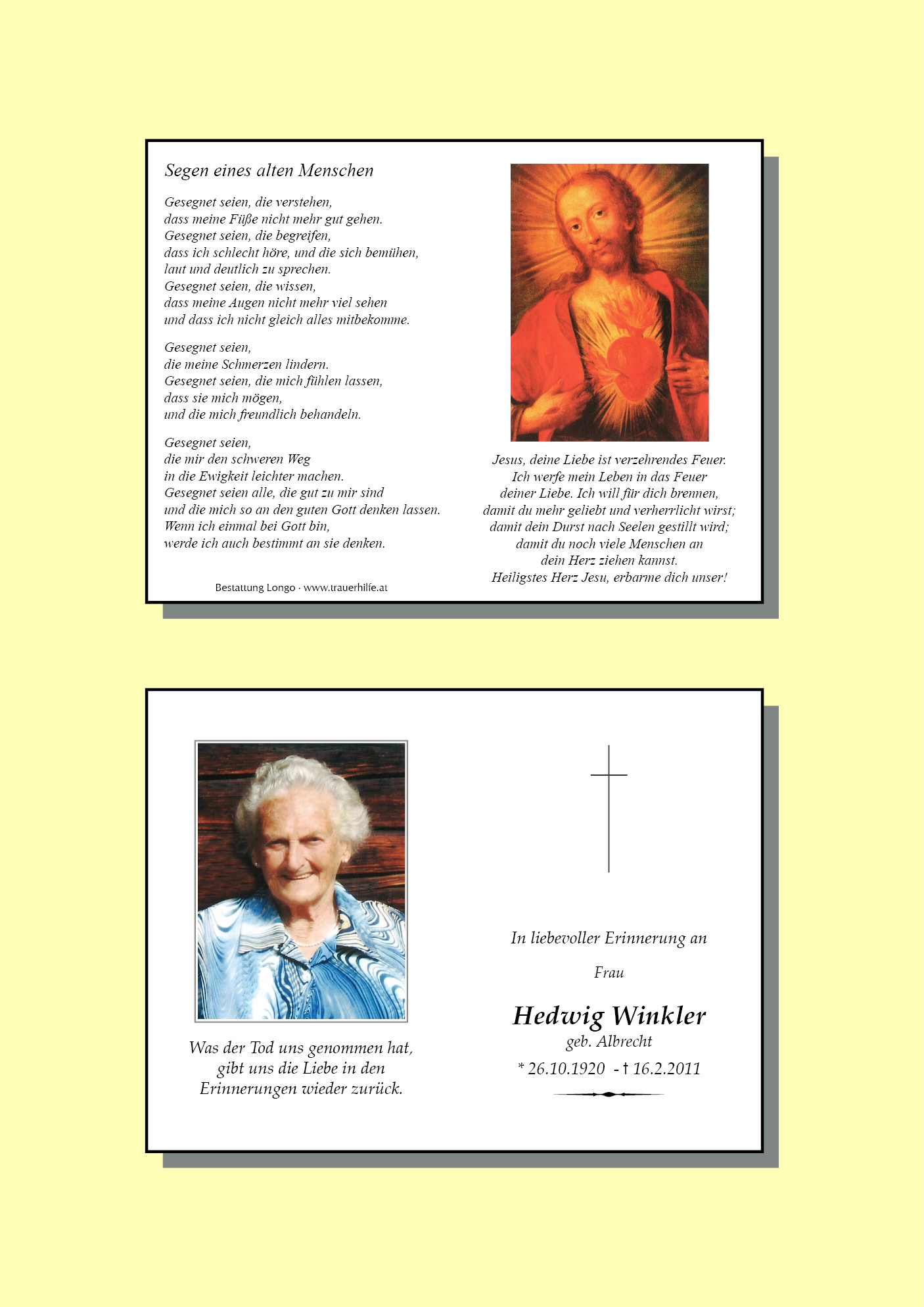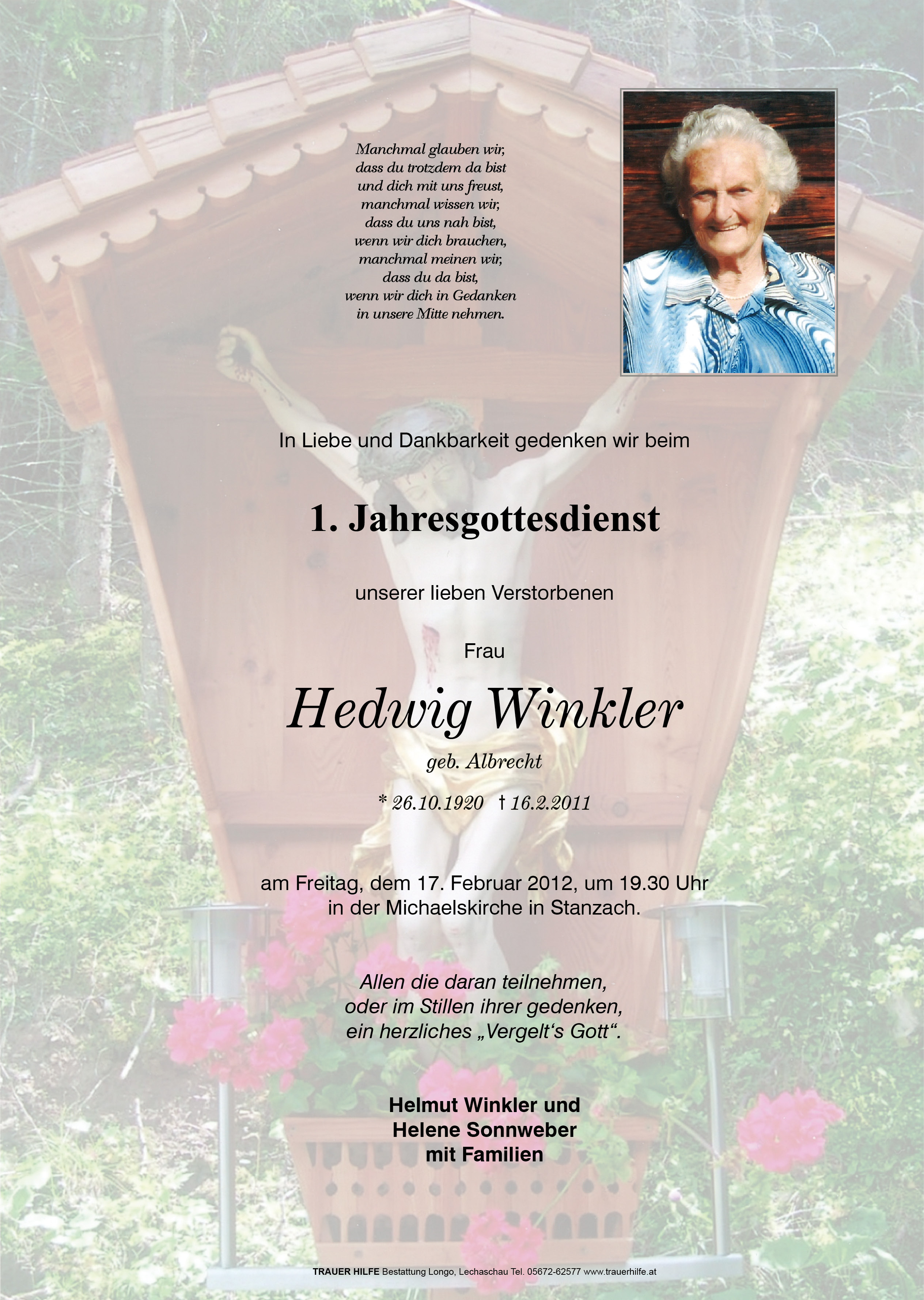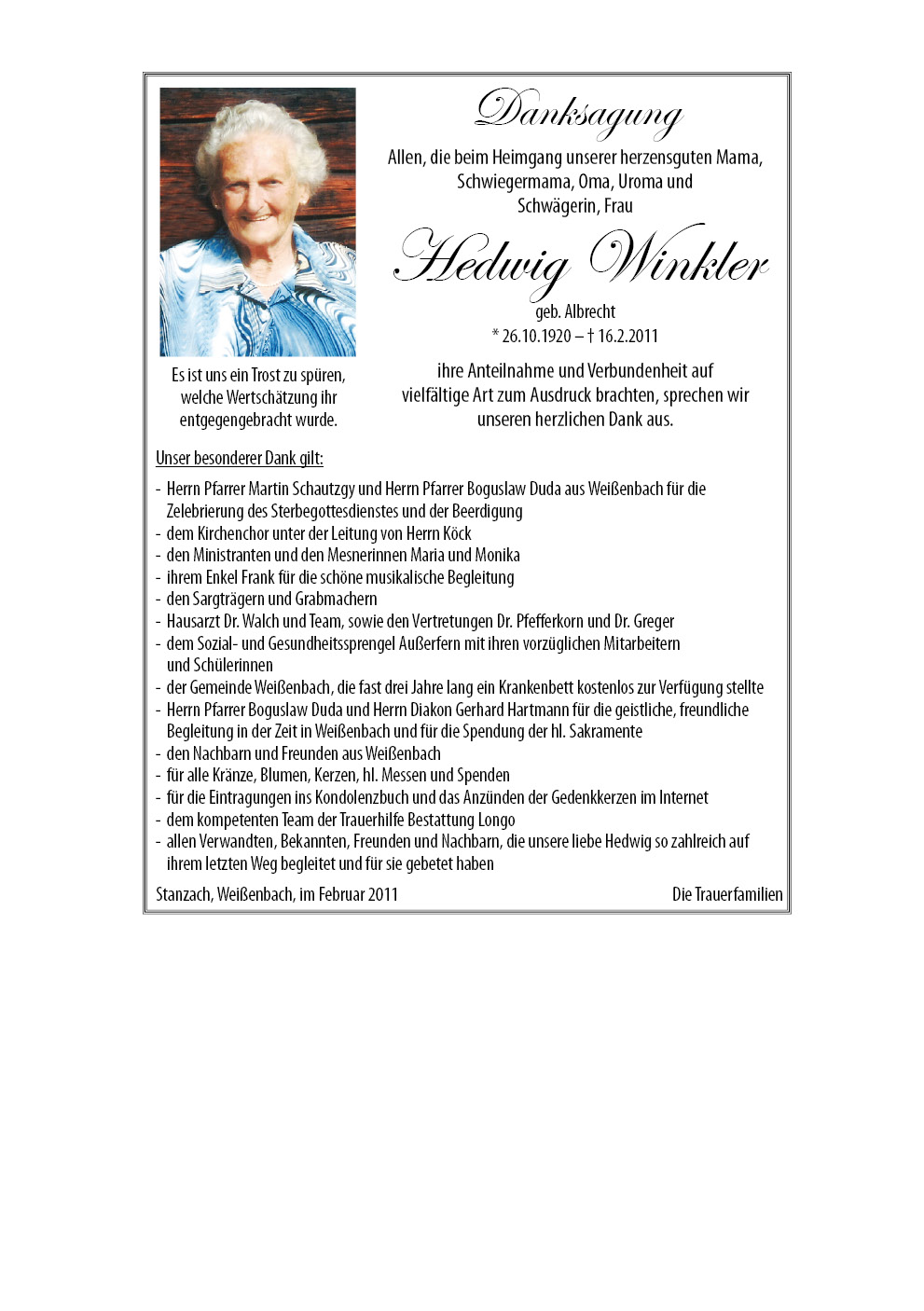 13.12.1901 16.02.2011 Stanzach Hedwig Winkler Action Parte Sterbebild Gedenkkerzen Kondolenzen Danksagung Jahrestag Parte Sterbebild Gedenkkerzen Kondolenzen Danksagung Jahrestag Parte herunterladen Sterbebild herunterladen Gedenkkerzen für Hedwig Winkler 6 Einträge Kerze anzünden Familie Hörting Alles Liebe zum Geburtstag Uroma Unvergessen Für Uroma Sozial- und Gesundheitssprenge Familie Heisinger, Katzelsdorf Ihre Gedenkkerze fürHedwig Winkler Ihr Name* Farbe auswählen Ihre Nachricht oder Name* E-Mail-Adresse* Mit dem Klicken auf "Kerze anzünden" erklären Sie sich mit unseren Datenschutzbestimmungen einverstanden. Kondolenzbuch für Hedwig Winkler 0 Einträge Kondolenz verfassen Ihr Abschiedsgruß an Hedwig Winkler Ihr Name* E-Mail-Adresse* Ihre Nachricht* Mit dem Klicken auf "Gruß absenden" erklären Sie sich mit unseren Datenschutzbestimmungen einverstanden. Danksagung herunterladen Jahrestag herunterladen
