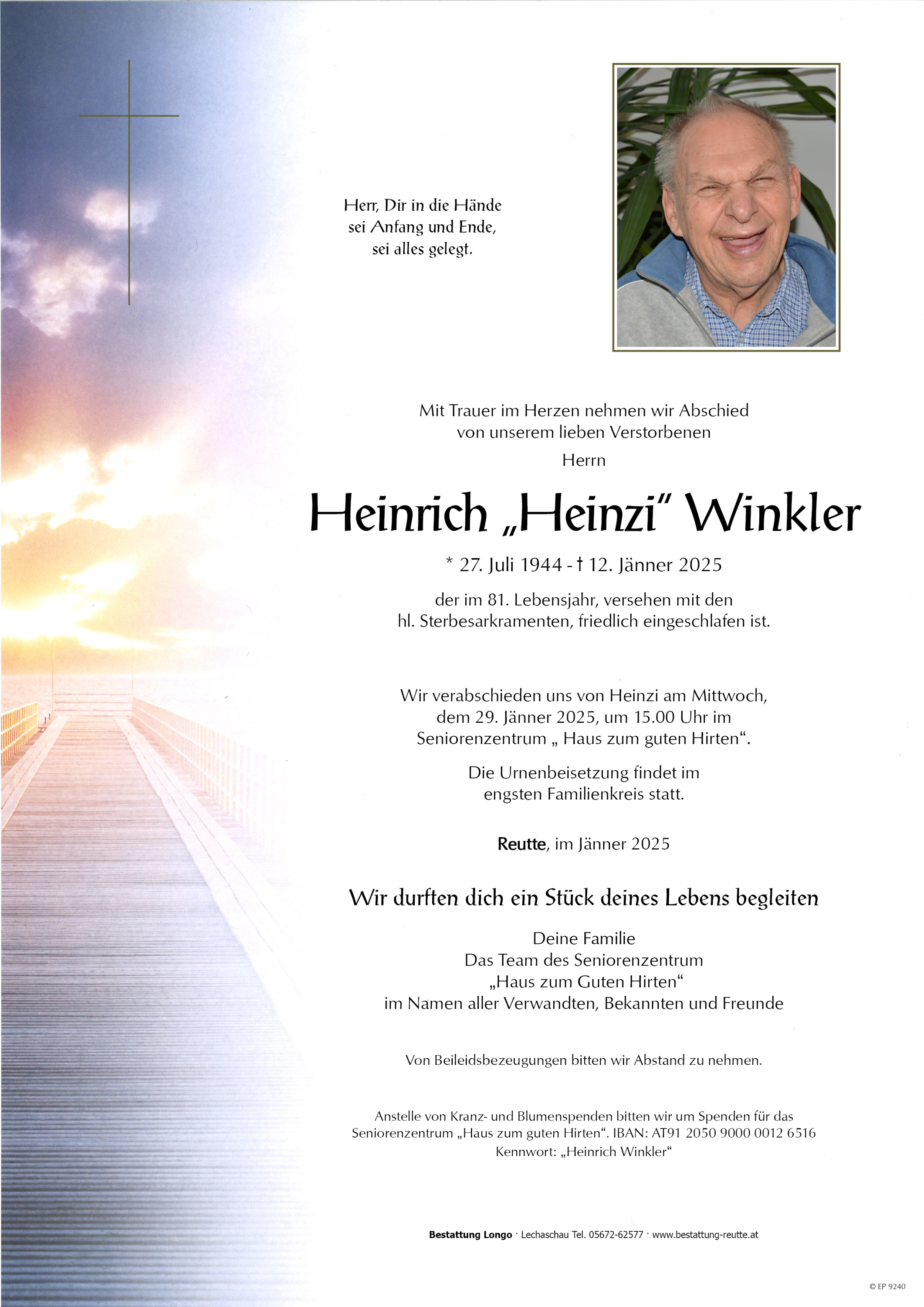 27.07.1944 12.01.2025 Reutte Heinrich "Heinzi" Winkler Action Parte Sterbebild Gedenkkerzen Kondolenzen Parte Sterbebild Gedenkkerzen Kondolenzen Parte herunterladen Sterbebild herunterladen Gedenkkerzen für Heinrich "Heinzi" Winkler 224 Einträge Kerze anzünden Olivera Mario Mario Ruhe sanft in Gottes Hand - Christine Perle Fam. Brandtner-Tannheimer Michael Mutschlechner Mario Seniorenzentrum Haus zum guten Hirten Fam. Christian&Claudia Hohenrainer Fam. Brandtner-Tannheimer Familie Müller Ruhe sanft in Gottes Hand - Christine Perle Michael Mutschlechner Sandra Schwarz Ruhe in Frieden! Ulli Hosp-Vils Mario Ruhe in Frieden ? Fam. Brandtner-Tannheimer Familie Müller RIP.Werner und Karin Kößler ?? Ruhe in Frieden Ruhe sanft in Gottes Hand - Christine Perle Irmgard und Guntram Eiter Michael Mutschlechner Ruhe in Frieden! Ulli Hosp-Vils Bogner Andrea In lieber Erinnerung? Olivera Simone Entstrasser Fam. Silvia und Hansjörg Kecht In lb. Erinnerung Wolfgang Puntigam mit Fam. Ruhe in Frieden! Anita Wibmer Herbert Suitner R.I.P Hildegard Schmidhofer Elisabeth Hornstein Verena Knittel Toni und Sigrid Eisele Mach\'s guat Heinzi, Michelle Helga & Toni Lutz Moni Pröbstl Liebe, Licht und Friede für dich! Ruhe in Frieden ? Erika Storf R.I.P. Judith Pürmayr Sonja Falger Edmund Winkler Angelika Pohler Daniela, Armin und Laura Rief Familie Valier Christoph Ruhe in Frieden Angelika Rita Gruber Familie Wechner ✨️?✨️ Claudia Hajek Lorenz Michaela Ruhe in Frieden Brigitte und Roland Nigg Ruhe in Frieden Lutz Maria Geborgen in Gott Marlen & Dietmar Wolfgang Eberle und Regina Martin und Heike Gassmann Lore Scheucher Marion Krümmling Gustl Ihrenberger Ein Licht für dich Ruhe in Frieden Heinzi, Sinah Fam . Alexandra & Günther Mair Pfiati Heinzi, Edeltraud ? Fam. Brandtner-Tannheimer Marion Haller (Hackl) Bernhard Sommerlechner Ruhe in Frieden Peter Müller Elfie Schlux Rief Horst Familie Anton Specht Annette Horst Familie Müller Ein Licht auf deinem Weg a Liachte auf deim Weg Lebe wohl, hab\'s schön im Himmel ?? Markus Meier Elmar R.I.P. Herbert & Margit Schennach Roland Falger R,I.P. Eva Hoellrigl Stefan & Lydia Beirer Fam. Gaby und Markus Wachter Waltraud und Othmar Wagner Andrea und Oswald Arzl R.I.P. Christine Weilharter-Scheiber R.I.P. Robert und Christl Leismüller In stillem Gedenken OSR Richard Wasle Familie Claudia und Stephan Hofer Evi und Hubert Überegger Bernhard Zaggl Gerlinde Haunsberger Ruhe in Frieden Greti Girl Ruhe in Frieden Wolf Helga Johanna Lettenbichler Frieda Mair Thomas Reinstadler Dagmar Lechleitner Anschitz Wolfgang Alexandra Rid Karin Kathrin Kuntara Ruhe in Frieden Monika Simader Hab\' fein im Himmel??⭐️? Gerti A Liachtle für die Reise? M.P In lieben Gedenken? Ruhe in Frieden Julia Gruber Alexander Ammann Ruhe in Frieden Elisabeth Matreux RIP Heinz u. Babsi vom Kreuz Gitta Schautzgy Evi Frischmann Fam. Paul & Konni Nessler ⭐ werner beyrer Walter Fellner Wolfgang Hosp Lechaschau/Pfronten Sommerlechner Werner ?️ Claudia Kuntara Christoph Hosp Renate Kuen Ruhe in Frieden R.I.P. Christl Strolz Ruhe in Frieden. Fam.Günter & Gitti Muglach Eberharter Peter und Anita Christian Tschiderer a Toni und Brigitte Illmer Erich und Rosina Köck R.I.P ??⭐️Luzia Wechselberger Ruhe in Frieden. Christine Strauß Ruhe in Frieden Manuela Bischof ERICH HOSP??? Fam. Sepp Steiner Maria Beyrer,Musau Marga Hackl Marga Hackl Ruhe in Frieden? Ruhe in Frieden! Dietmar und Ulli Hosp Fick Renate Fam. Tamara Perl Fam. Wiesenegg Dietmar Margit Ralser LisaS Schlaf wohl lieber Heinzi LISI ?? Annemarie & Bruno HAUG RIP RIP.Werner und Karin Kößler ?? Werner Böhm & Heide Thiele Ruhe in Frieden lb. Heinzi Rosmarie und Andrea Grubmüller Ernst Gutmann Ingrid Gruber ? Karl u . Marianne Hold Sinka und Gerd Leitner Pflach Hannelore u. Klaus Witting Irma Frischmann Andrea Hohenrainer Ruhe in Frieden Beirer Roland und Gabi Andreas Melekusch Ruhe sanft in Gottes Hand - Christine Perle Fam. Andreas und Christina Wiesenegg Maria Martina Posch ✨ Moni Pröbstl Gute Reise Birgit ? Fam. Oskar u. Marlies Ginther Ramona Siegele Seniorenzentrum Haus zum guten Hirten Ruhe in Frieden Renate Praxmair ??? Fam. Betina u. Stefan Schönauer Fam. Fritz Sprenger Fam. Wagner-Stöger Brigitte Dreier Angelika und Andreas Seidel Helene und Fritz Wendlinger Marlies Oberbreyer Andrea Alber Claudia Wellenzohn Friederike Thomas Frick R.I.P, Erich Unterhuber Annemarie Gerber Ruhe in Frieden Fam. Rosmarie Hohenrainer Wohlgenannt Stephi RIP ✨ Fam. Monika u. Hans-Peter Höfler Fam. Edi Ammann Fam. Klaus und Petra Eberle Fam. Mia und Helmut Male Familie Ginther Regensberger Conny und Wolfgang Ruhe in Frieden Margit und Johann Fasser Ruhe in Frieden Erich und Vroni Forcher Michael Mutschlechner Margarete und Emmerich Lutz Fam. Paul Kaiser ÖZIV Bezirksgruppe Reutte Fam. Monika und Christian Bartel Zdenko und Ulli Busic Fam. Gasser / Franz ? Pepi Kogler Susi Huber Ernst J. Messmer & Kirsten Aufrichtige Anteilnahme Anna-Maria Tschiderer Michael Hofer Fam. Paul Kerber Wohlgenannt Rebecca Elisabeth Lechner Thomas Bailom Sieglinde und Gerfried Breuss Ralph Kunze mit Familie Fam. Heribert u. Anni Bailom Kirsten Posch Angelika Claudia Schreieck TrauerHilfe Bestattung Longo Ihre Gedenkkerze fürHeinrich "Heinzi" Winkler Ihr Name* Farbe auswählen Ihre Nachricht oder Name* E-Mail-Adresse* Mit dem Klicken auf "Kerze anzünden" erklären Sie sich mit unseren Datenschutzbestimmungen einverstanden. Kondolenzbuch für Heinrich "Heinzi" Winkler 0 Einträge Kondolenz verfassen Ihr Abschiedsgruß an Heinrich "Heinzi" Winkler Ihr Name* E-Mail-Adresse* Ihre Nachricht* Mit dem Klicken auf "Gruß absenden" erklären Sie sich mit unseren Datenschutzbestimmungen einverstanden.