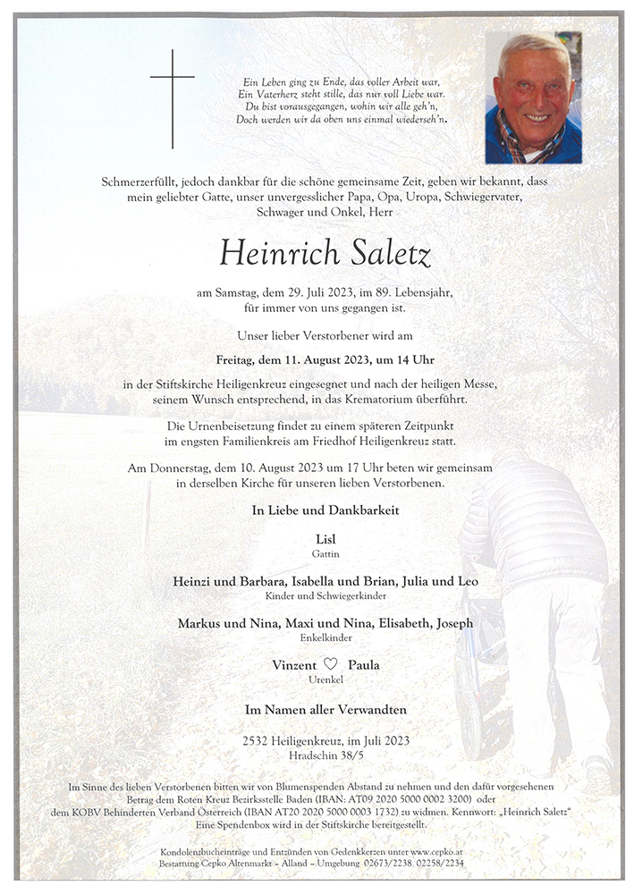Zum Verlust von Eurem lieben Heinrich möchten wir Euch unser aufrichtiges Beileid und tiefes Mitgefühl ausdrücken.