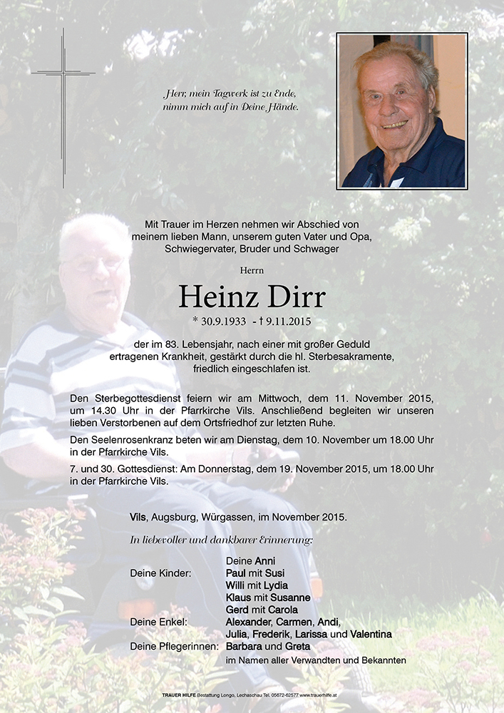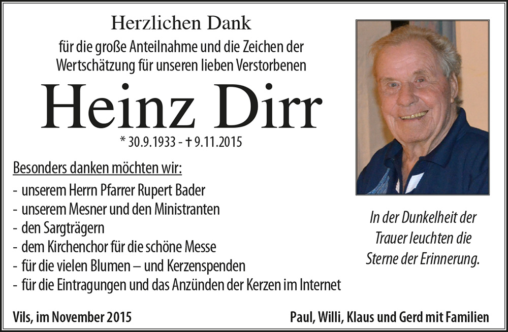 Durch Eure Fürsorge konnte er bis zum Schluss im Kreise seiner Familie bleiben. Behaltet ihn so in Erinnerung, wie er in den schönsten Stunden mit euch beisammen war.