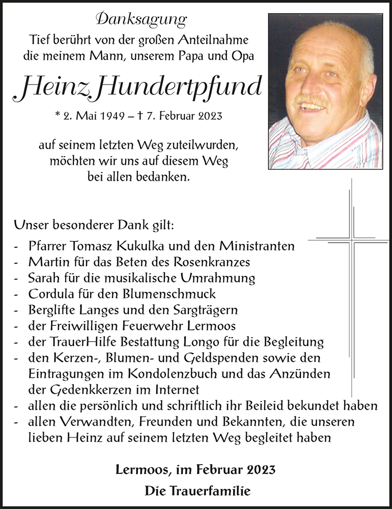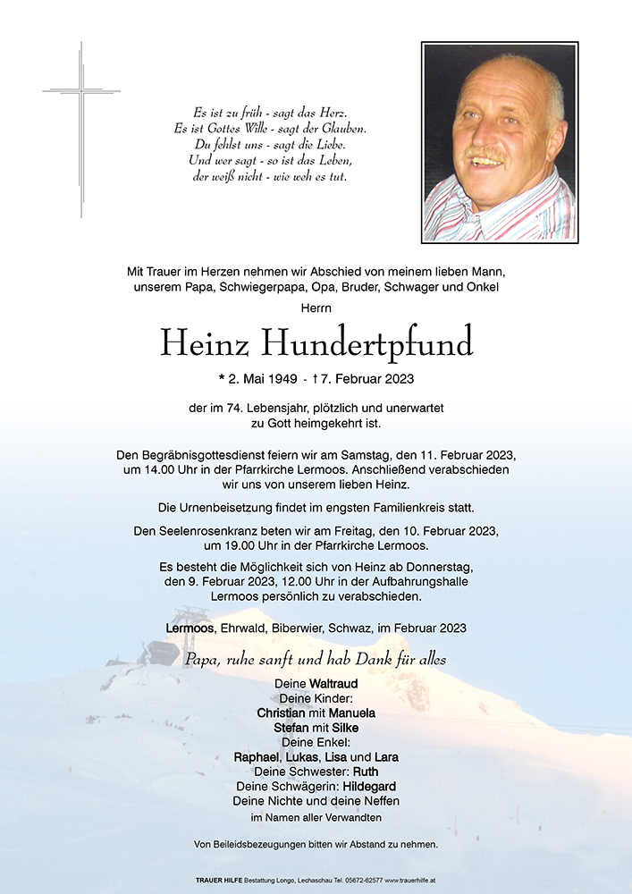 Ich kannte Heinz schon als Lausbub in der Schule bis zum letzten Klassentreffen und bin sehr traurig. Zufällig sah ich beim letzten Reutte-Besuch die Danksagung.