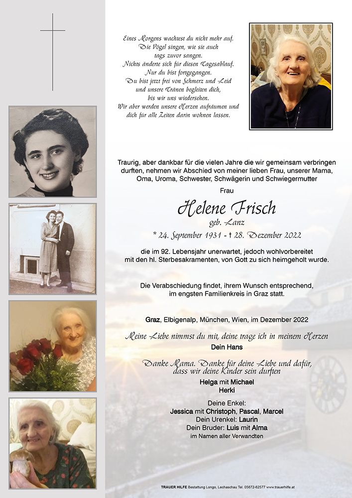 24.09.1931 28.12.2022 Graz Helene Frisch Action Parte Sterbebild Gedenkkerzen Kondolenzen Parte Sterbebild Gedenkkerzen Kondolenzen Parte herunterladen Sterbebild herunterladen Gedenkkerzen für Helene Frisch 8 Einträge Kerze anzünden Für dich und deine Familie Sabine Scheidle mit Kinder Ruhe in Frieden Mama Ruhe in Frieden Mama Ruhe in Frieden Mama Claudia Magdalena TrauerHilfe Bestattung Longo Ihre Gedenkkerze fürHelene Frisch Ihr Name* Farbe auswählen Ihre Nachricht oder Name* E-Mail-Adresse* Mit dem Klicken auf "Kerze anzünden" erklären Sie sich mit unseren Datenschutzbestimmungen einverstanden. Kondolenzbuch für Helene Frisch 0 Einträge Kondolenz verfassen Ihr Abschiedsgruß an Helene Frisch Ihr Name* E-Mail-Adresse* Ihre Nachricht* Mit dem Klicken auf "Gruß absenden" erklären Sie sich mit unseren Datenschutzbestimmungen einverstanden.