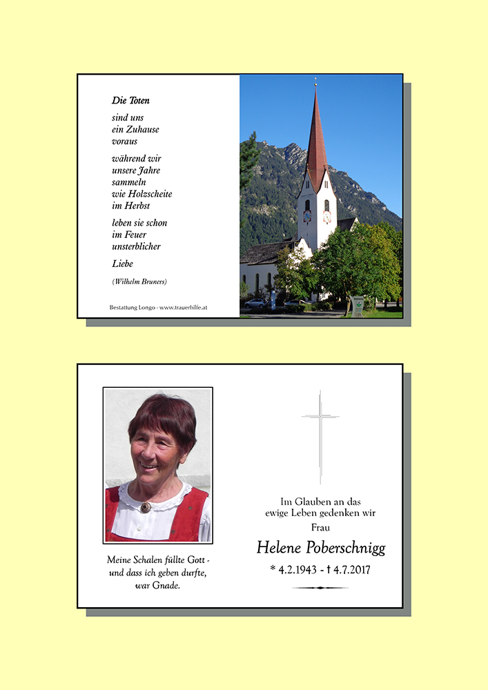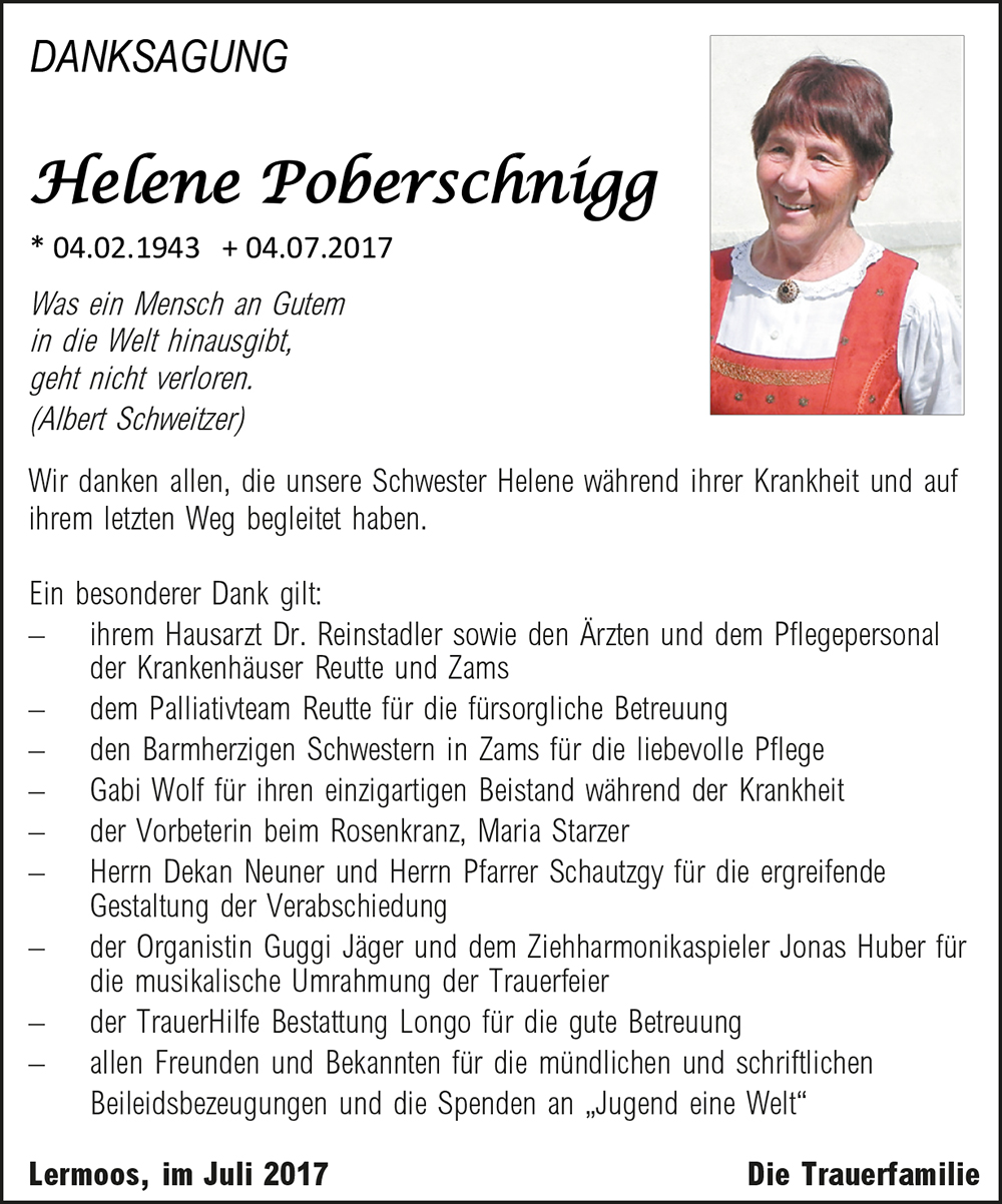 "Die Welt braucht Menschen, die für andere da sind", das sagte einmal Kardinal J.Höffner. So jemand war Helene! Immer für andere da! Wenn man Helene um etwas bat, half sie sofort. Jahr für Jahr hat sie für die Breitenwanger Kirche eine kunstvolle Osterkerze gemacht. An einem großen Wandteppich für die Reuttener Pfarre hat sie monatelang genäht und gestickt. Bei Basaren war sie mit Rat und Tat zur Stelle. Darüber hinaus hat sie unzählige Trachtenkurse und Bastelkurse gehalten. Sicher erinnern sich viele von uns noch an die Handarbeitsausstellung im Grünen Haus, wo wir ihre kunstvollen Handarbeiten bewundern konnten. Bei Reisen und Schitouren war sie immer eine sehr rücksichtsvolle und hilfsbereite Kollegin. Kam sie zu Besuch, brachte sie immer etwas Selbstgemachtes mit. Manchmal erfreute sie uns mit einem bunten Bergblumenstrauß. Es ließe sich noch viel, sehr viel schreiben.