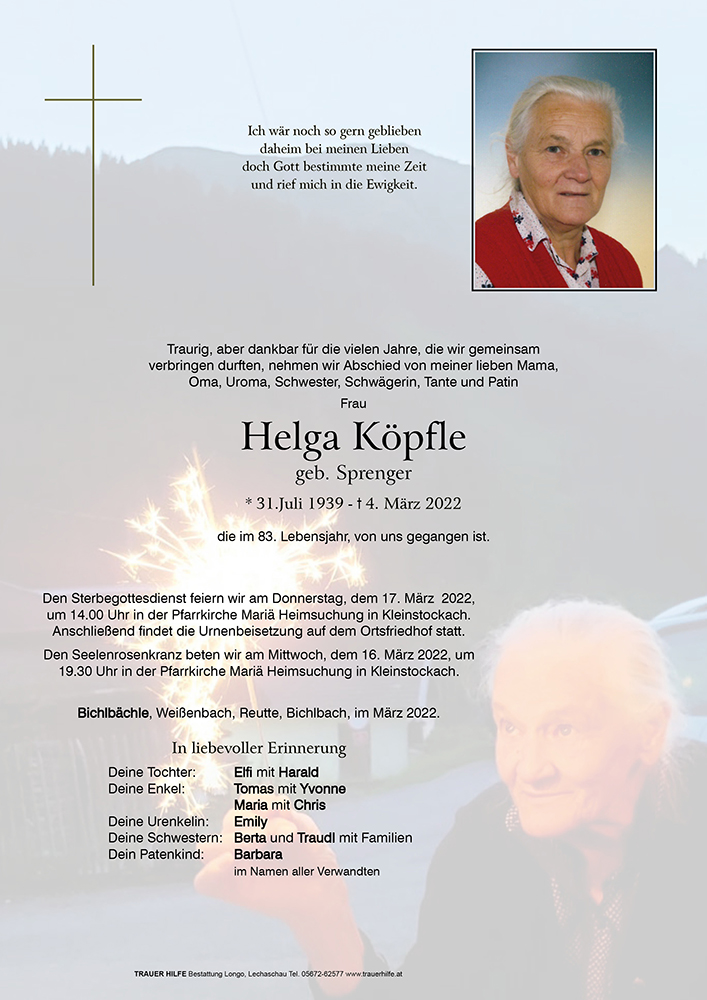 Liebe Elfi Werte Trauerhilfe! Mein aufrichtiges Beileid zum Tod deiner Lieben Mama, ich wünsche euch viel Kraft in dieser schweren Zeit. LISI