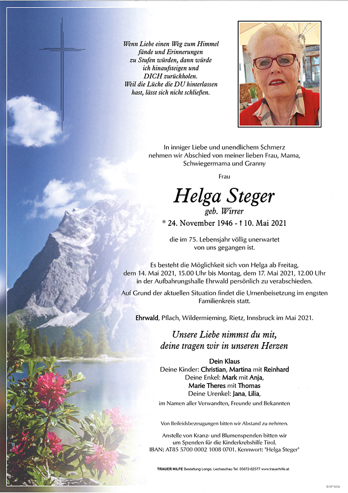 ... während ich hier sitze, und der stift schwer wird.. vom schreiben wenn ich an dich denke.. weiss ich, dass ich im Namen aller, und aller die dich kannten mit gutem gewissen sagen kann, .. dass soviele von uns, und alle deine Kinder, wir, die Kinder des Zugspitzdorfes dich auf ewig bei uns tragen werden. Doch wenn wir, und wenn ich an dich denke.. dann fällt mir da sovieles ein, soviel grosses. Soviel schönes, einfach.. wunder.. wunderschönes. Wer du für uns warst, für uns Kinder, ist so viel mehr.. dass es schwer fällt die Worte zu finden, wer du warst, für mich, und für uns alle. Was du bewirkt hast, mit deinem unverkennbar, einzigartigem, und wunderschönem Wesen. Es war ein Geschenk, dich zu kennen. Und noch viel mehr warst du das Geschenk, dass unsere Leben und das Leben unseres Dorfes, die Seele Ehrwalds so tief bereichert hat. Ich weiss, dort wo du jetzt bist,.. hast du’s gut. Stets hast du uns umarmt, getragen. Dein Herz soll Gott für immer wahren. So leise gingst du von uns fort, leb wohl’ mach’s gut.. nimm mich beim wort. Wenn ich dir sag, dass du für uns, in uns & bei uns bist. Du hast uns und alle auf gezogen, beschenkt mit liebe, und soviel güte. Gelacht, gelebt, gegeben. Das ganze Dorf hast du gezeichnet, uns alle in dein Reich geschmeichelt. Wir werden dich, so sehr vermissen... uns immer an dich tief drin erinnern. Du wirst für immer in uns weiter leben, so liebevoll, herzlich und gütig, besonders... wie du warst - das gibts ganz selten. Jetzt denk ich an dich, du bist da ganz oben.. siehst herab - schaust auf uns alle nieder. Ein Schutzengel, ja das bist du für alle zeiten. Wir alle werden immer du dir halten. Dein Geist der wird nie von hier gehen, auch von der Ferne siehst du uns grüssen.