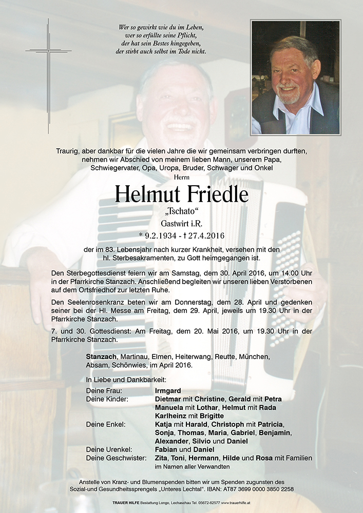 ein wertvoller mensch,und teil meiner schönen jugendzeit in stanzach ist zum herrn heimgegangen, voller bewunderung hing ich immer an deinen lippen wenn du mit deiner herrlichen stimme,den "erzherzog jodler" anstimmstest, zuletzt am geburtstag meiner mutter,die auch nur schwärmend von dir, und der stimmung im cafe helmut, deinem weitum bekannten musikcafe begeisternd sprach.lieber helmut möge da wo du jetzt bist viel musik und gastfreundschaft herrschen ,ein dich vermissender toni friedle .....