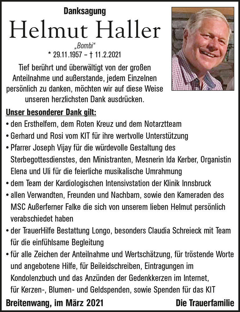 Tief betroffen habe ich vom plötzlichen Tod von Helmut erfahren. Über diesen Weg möchte ich Dir und deiner Familie viel Kraft für die Zukunft wünschen.