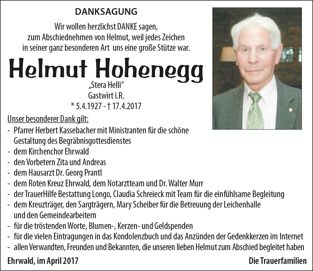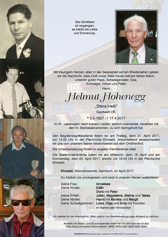 Die Nachricht von Helmuts Tod hat mich ganz unerwartet getroffen. Wir hatten uns gerade in letzter Zeit ab und zu beim Spazierengehen getroffen und auch ein paar Worte gewechselt. Mit Helmut habe ich die erste Volksschulklasse besucht, wir sind auch eine Zeitlang zusammen zur Schule nach Garmisch gefahren. Ich denke auch noch gerne an unseren 50ger Ausflug nach Salzburg zurück. Viele von unseren Jahrgängern sind uns schon vorausgegangen.
