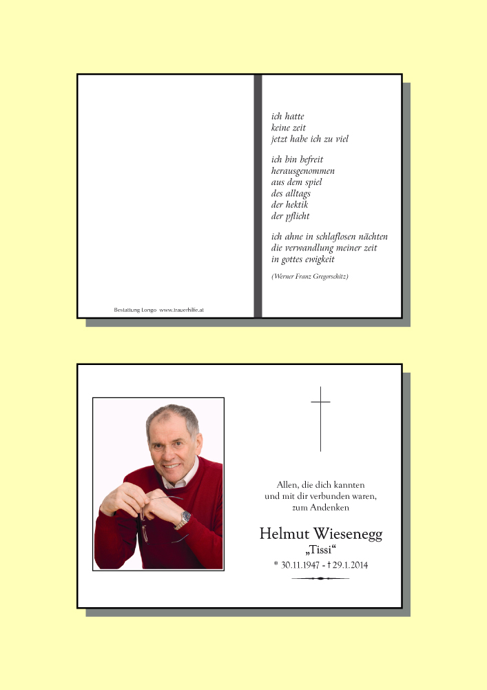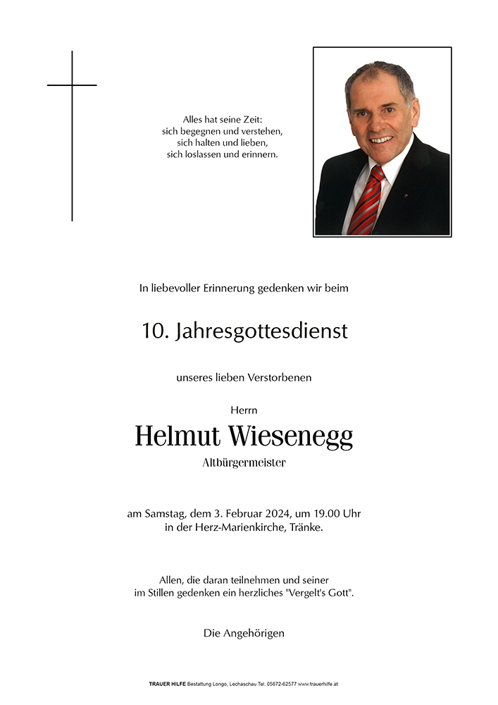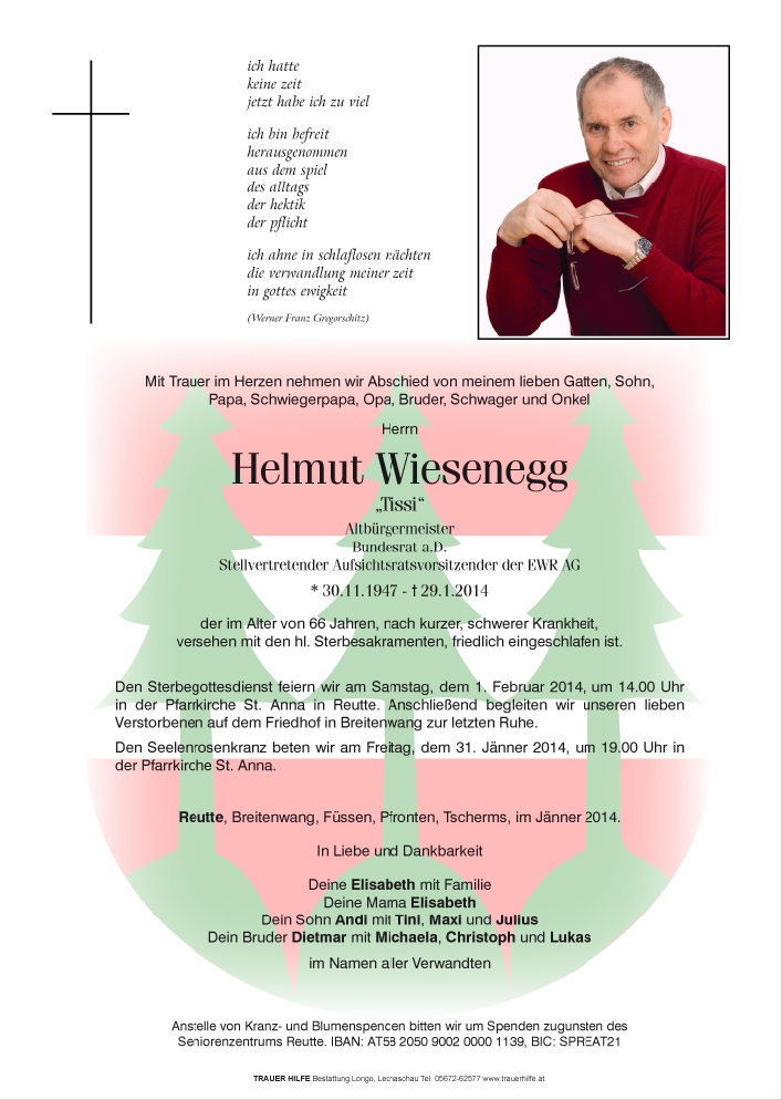 Mit großer Betroffenheit habe ich vom Ableben meines Freundes Helmut Wiesenegg erfahren. Allen seinen Angehörigen möchte ich aufrichtige Anteilnahme aussprechen. Ich werde ihn ímmer in Erinnerung behalten.