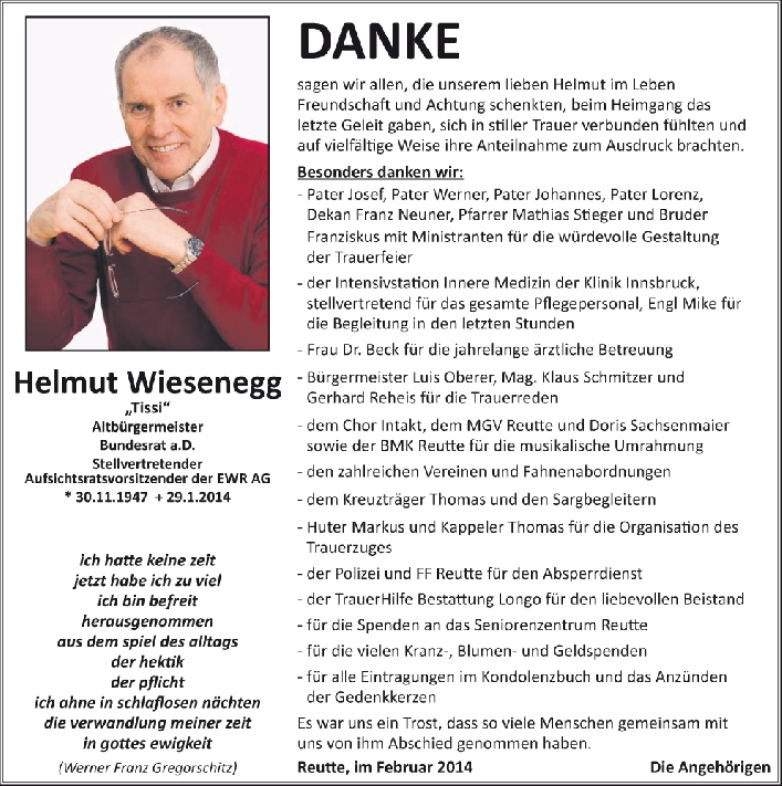 Wir haben Helmut Wiesenegg als einen Politiker kennengelernt, dem die Jugend und deren schulische Ausbildung immer am Herzen lag. Er hat uns in seiner politischen Funktion als Bürgermeister von Reutte tatkräftigst unterstützt und war stets aufgeschlossen gegenüber Neuerungen und Veränderungen. Ihm war immer bewusst, dass die Entwicklung von Reutte und damit die Entwicklung der gesamten Region unmittelbar mit der schulischen Entwicklung zusammenhängt. Hier gilt ihm unsere größte Anerkennung.