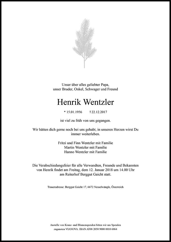Tief betroffen von Henriks plötzlichen Tod entbieten wir unsere aufrichtige Anteilnahme.