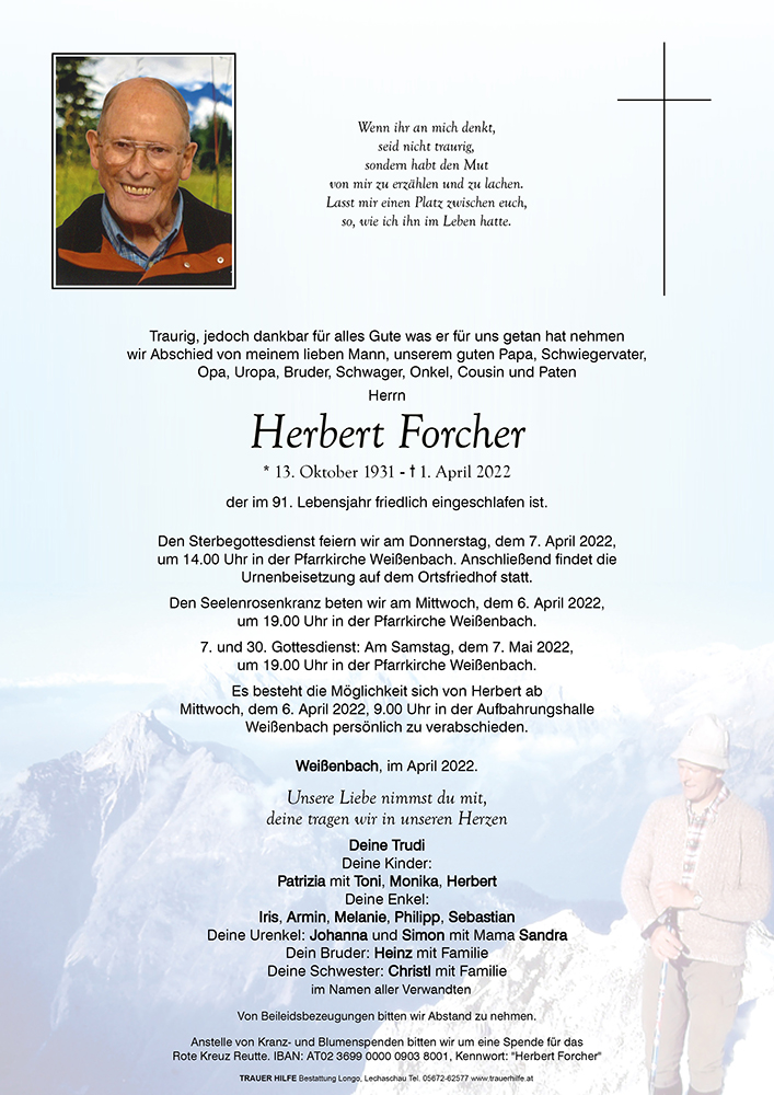 Herzliches Beileid! Ich habe beste Erinnerungen an Herbert, dem guten Freund meines Schwiegervaters Fritz Huber, zuletzt in Elmen wohnhaft.