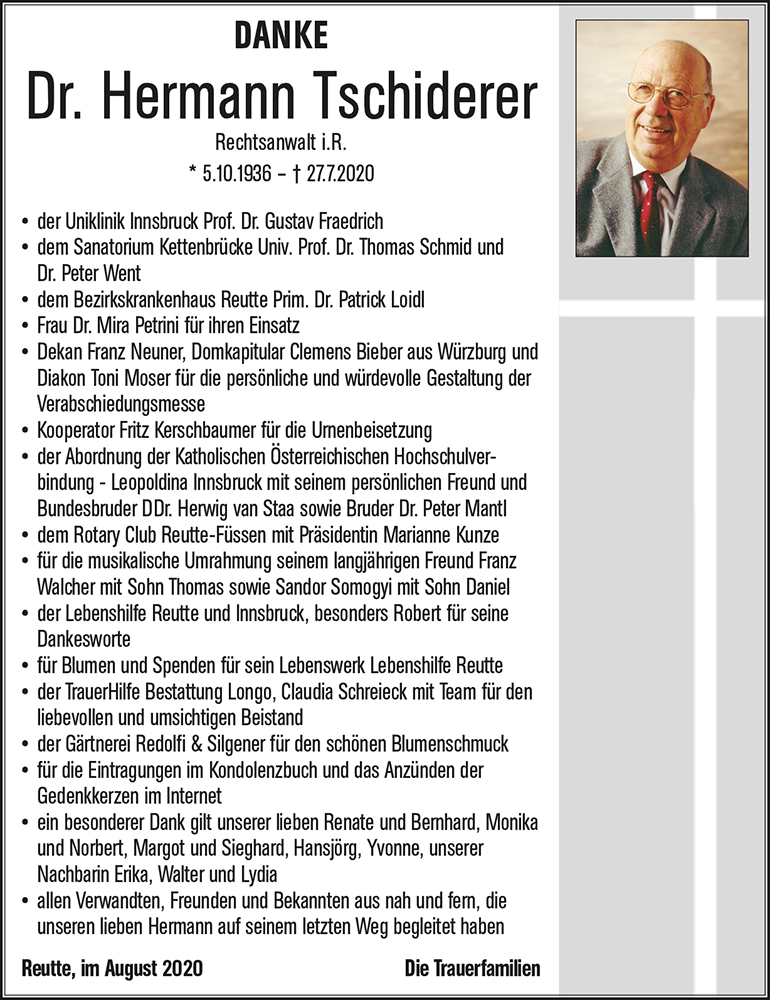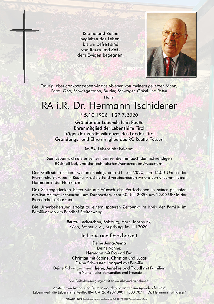 Dr. Tschiderer, dh Hermann, wie ihn so viele liebevoll genannt haben, hat viele Spuren der Liebe und Fürsorge hinterlassen, Großes für die Lebenshilfe Reutte geschaffen und somit wird die Erinnerung an ihn stets lebendig bleiben.