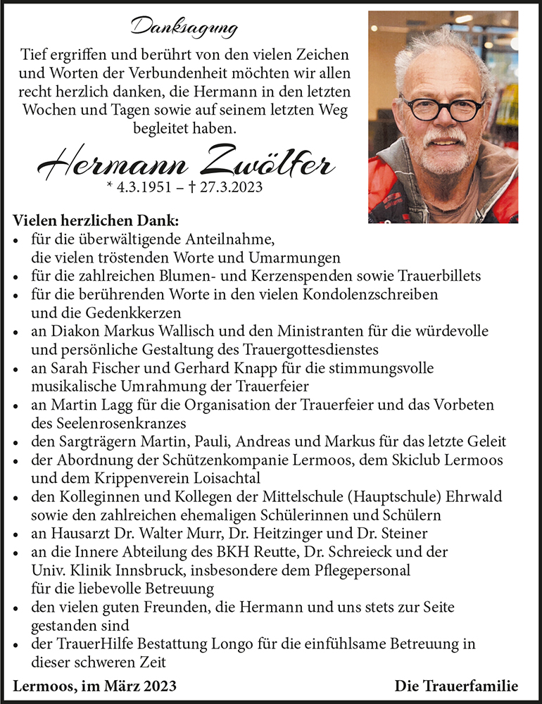 mit tiefer Betroffenheit und Entsetzen haben wir die traurige Nachricht vernommen. Durch Worte ist unserer Trauer kein Ausdruck zu verleihen. Mit Hermann hat uns ein lieber Mensch und Freund verlassen, den wir sehr vermissen werden. Trost spendet uns der Gedanke, dass er nun kein Leiden mehr zu ertragen hat.
