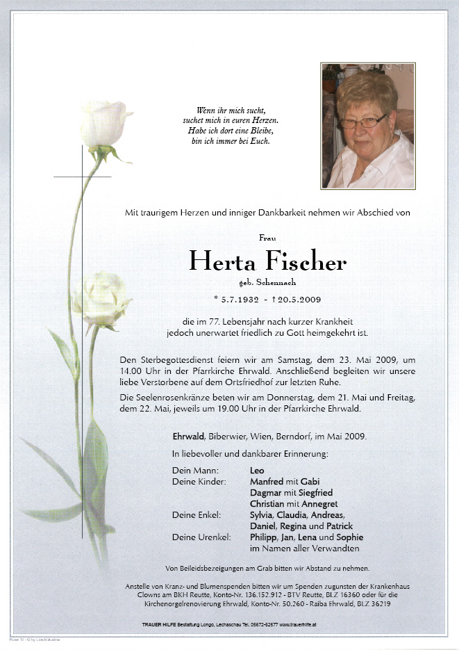13.12.1901 20.05.2009 Ehrwald Herta Fischer Action Parte Gedenkkerzen Kondolenzen Parte Gedenkkerzen Kondolenzen Parte herunterladen Gedenkkerzen für Herta Fischer 1 Eintrag Kerze anzünden Ein Licht für die Ewigkeit! Ihre Gedenkkerze fürHerta Fischer Ihr Name* Farbe auswählen Ihre Nachricht oder Name* E-Mail-Adresse* Mit dem Klicken auf "Kerze anzünden" erklären Sie sich mit unseren Datenschutzbestimmungen einverstanden. Kondolenzbuch für Herta Fischer 0 Einträge Kondolenz verfassen Ihr Abschiedsgruß an Herta Fischer Ihr Name* E-Mail-Adresse* Ihre Nachricht* Mit dem Klicken auf "Gruß absenden" erklären Sie sich mit unseren Datenschutzbestimmungen einverstanden.
